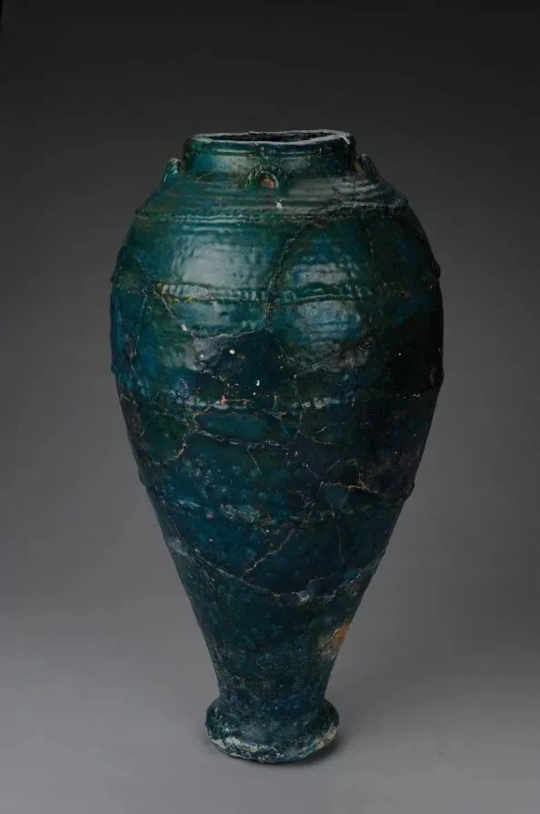 同样于刘华墓中出土的三件“波斯孔雀蓝釉陶瓶”,是我国最早发现的孔雀蓝釉类器物,其清雅的釉色,是海上丝绸之路文化交流最静默又最华丽的见证。 三件陶瓶外形硕大、造型独特、釉色新颖,瓶子表面用一种介于蓝、绿色之间的釉色,釉层较厚,釉色称为“孔雀蓝釉”或“孔雀绿釉”。