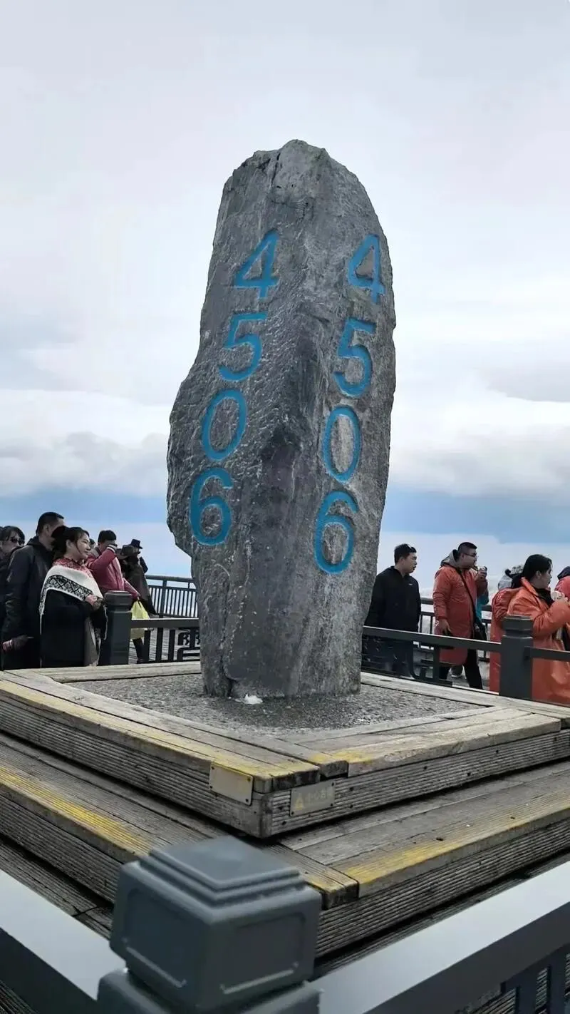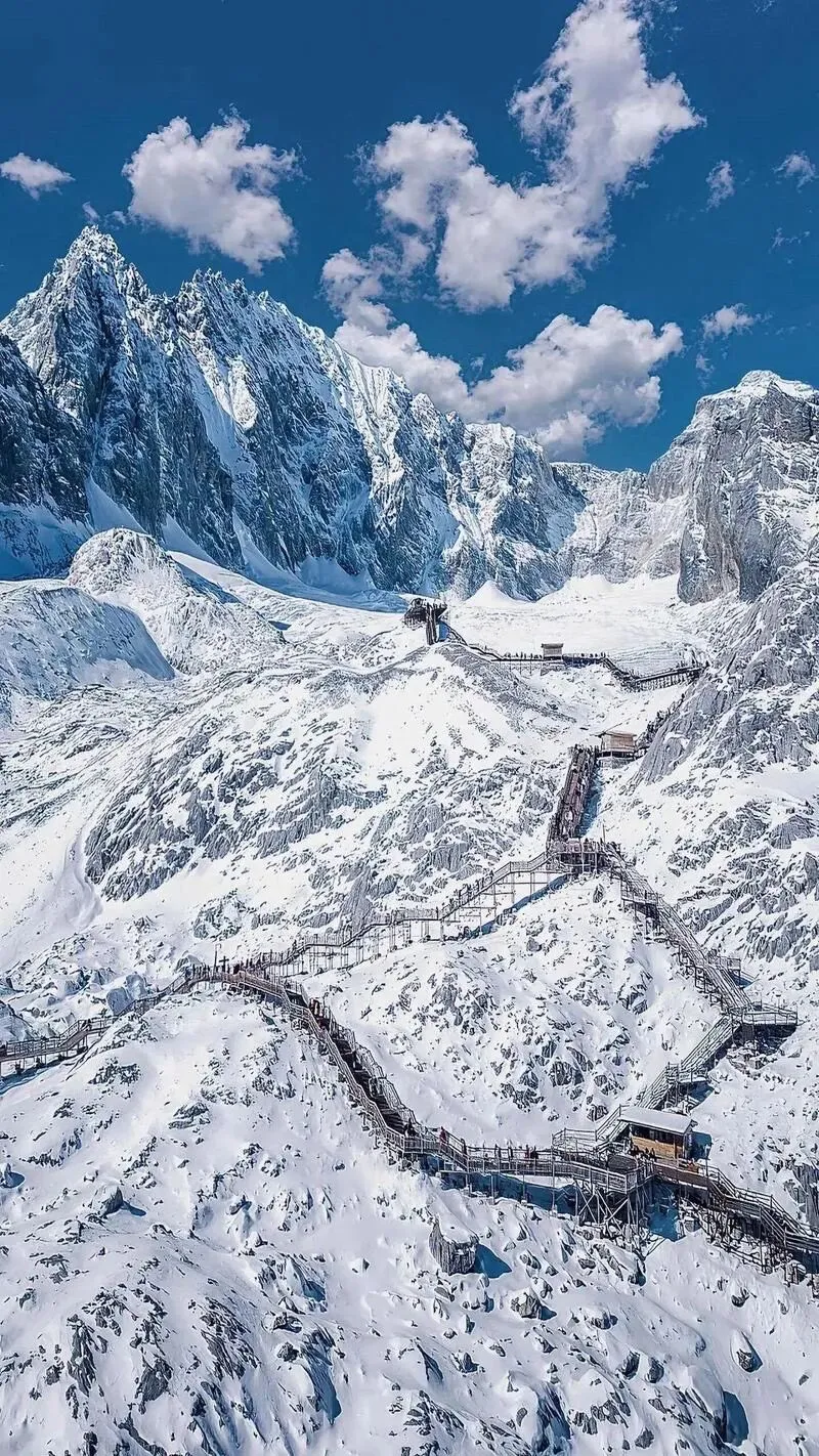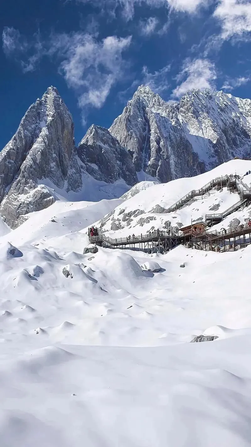 到了4506的平台,景色确实很美,玉龙山半个山体被积雪覆盖,下面的部分是裸露的岩石。风一吹,雪被刮起,像一条雪龙再空中旋转。阳光照在雪山上,白皑皑的,虽然漂亮却很刺眼,需要戴好墨镜,否则时间长了会出现雪盲症。其实还可以往上爬,可以到达4680,(最高峰5590.2米)但闺女很谨慎,不想冒险,我们就直接放弃了。拍完照,呆了一会儿就坐另外一条索道直接去蓝月谷了。