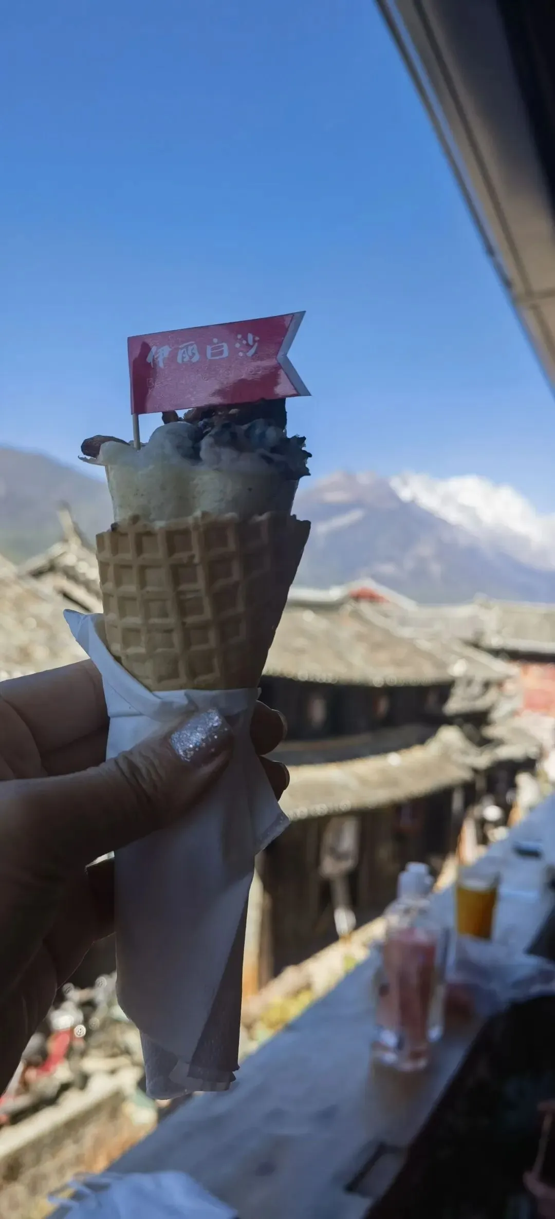 在那里我们跟朋友(她晚了几天到丽江)汇合。一起逛,一起闲聊,一起拍照留念,在小院里喝咖啡,抬头就是玉龙雪山。在咖啡馆的二楼拍了很多雪山和古镇照片。坐在小店的二楼,一边吃东西,一边欣赏远处的雪山美景。