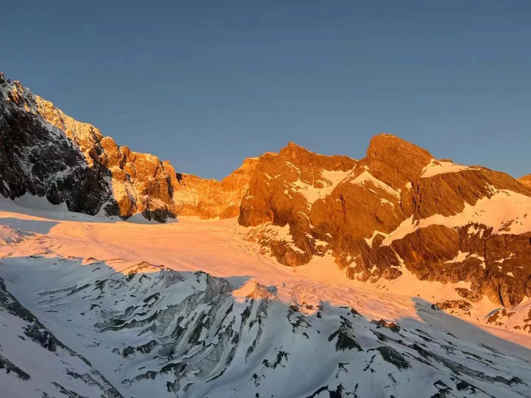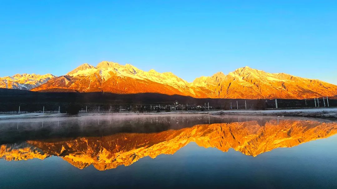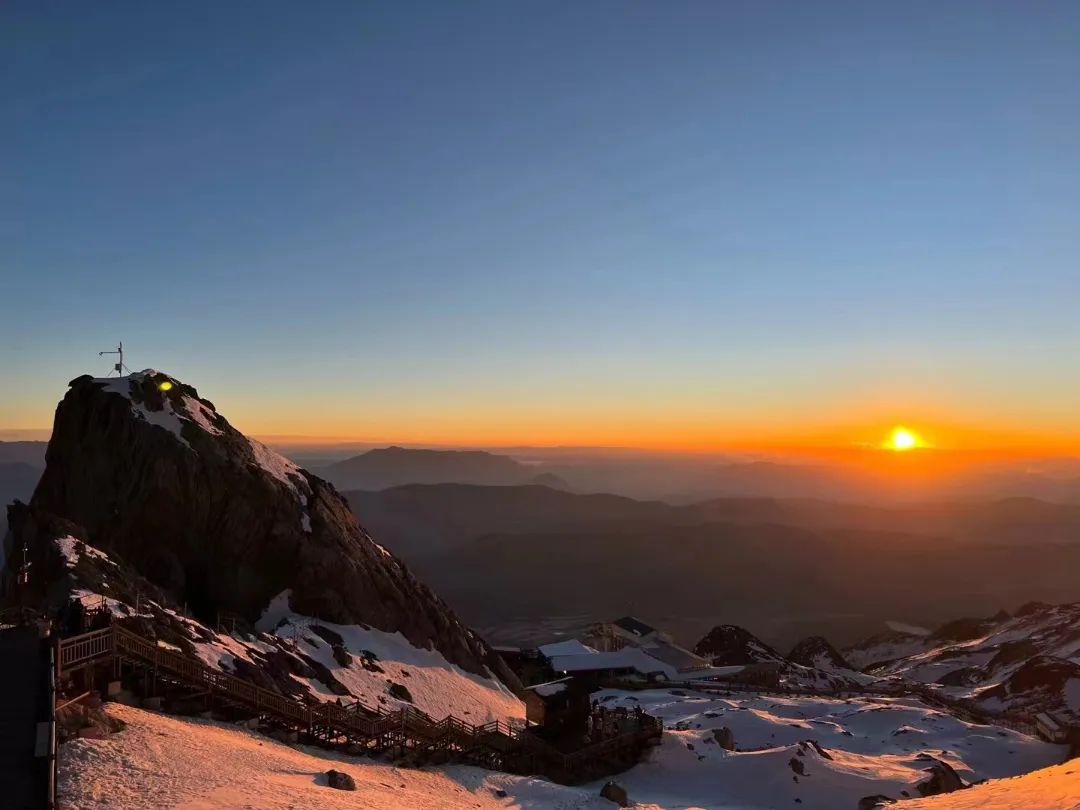 远处的玉龙雪山在夕阳下熠熠生辉