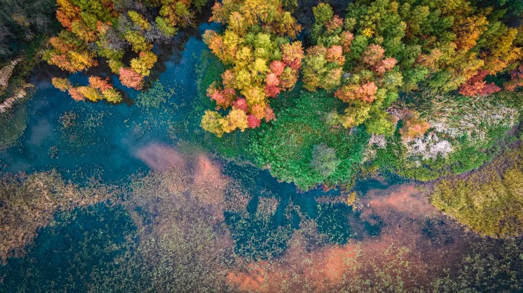 岸边水杉正红,海鸟低飞