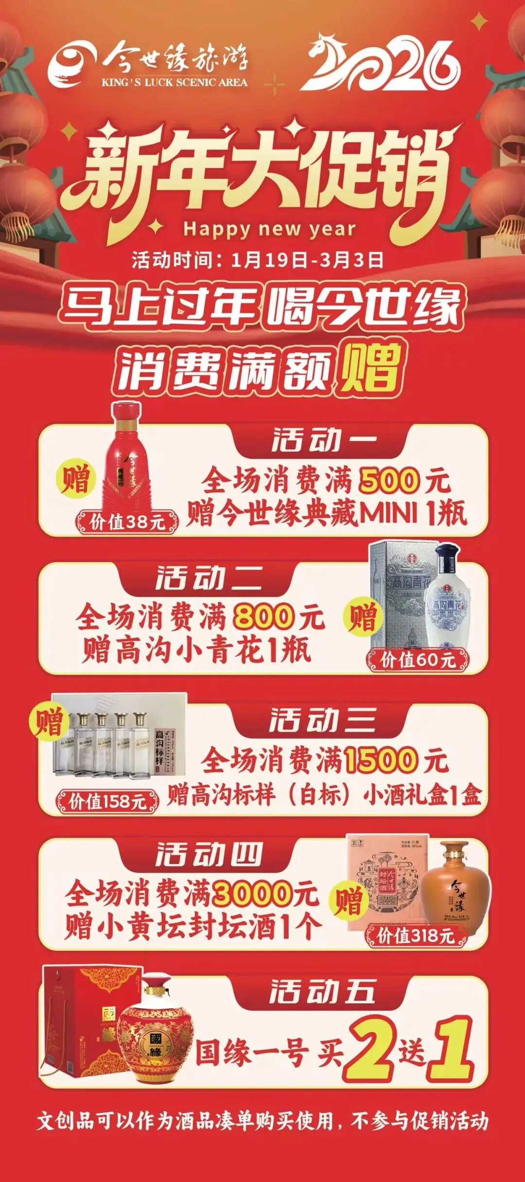逛景区、品美酒、享福利!春节期间,景区酒水特惠来袭,全场消费满500元即有精美好礼相赠,把今世缘的醇香与新春的福气一同带回家,无论是自留小酌,还是走亲访友,都是一份有心意、有格调的好选择。
