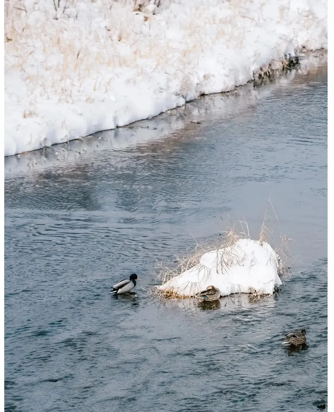 沿着植物园前的北大路桥上眺望北山,纷飞的细雪给景色添上了朦胧的滤镜,岸边有些是风雪无阻散步的住民,打雪仗、堆雪人的学生,最惬意的,好像还是那些晃晃悠悠的小鸭子们。🦆