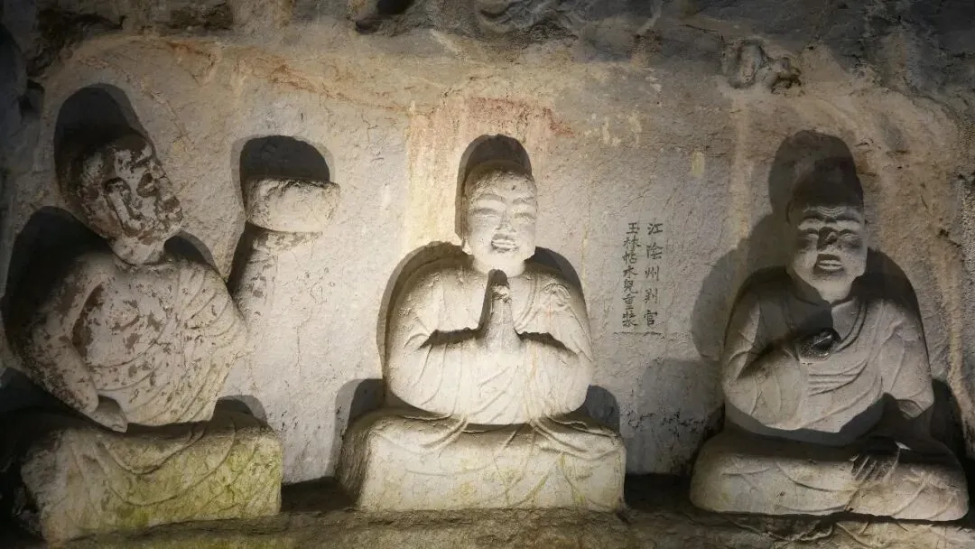 接着就到了飞来峰摩崖石刻的区域。这是我最想给爸爸妈妈介绍的地方,也是灵隐景区最重要的景观之一。我告诉他们,飞来峰的石刻从五代时期开始建造,经过宋,元,明三个朝代,陆陆续续雕刻完成,现存有几百尊佛像,是我国非常珍贵的古代石刻文物。这些石刻分布在山崖和石壁上,有的位置高,有的位置低,大小不一,形态各不相同。我们一路慢慢走,一路抬头观看,很多佛像保存得比较完整,面容清晰,神态安静,也有一些因为年代太久,经过风吹雨淋,轮廓变得模糊,但依然能看出当年工匠雕刻得十分认真。
