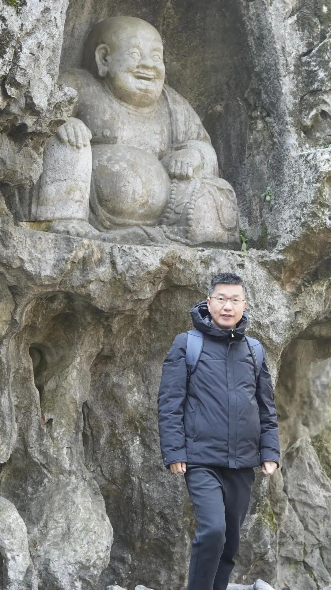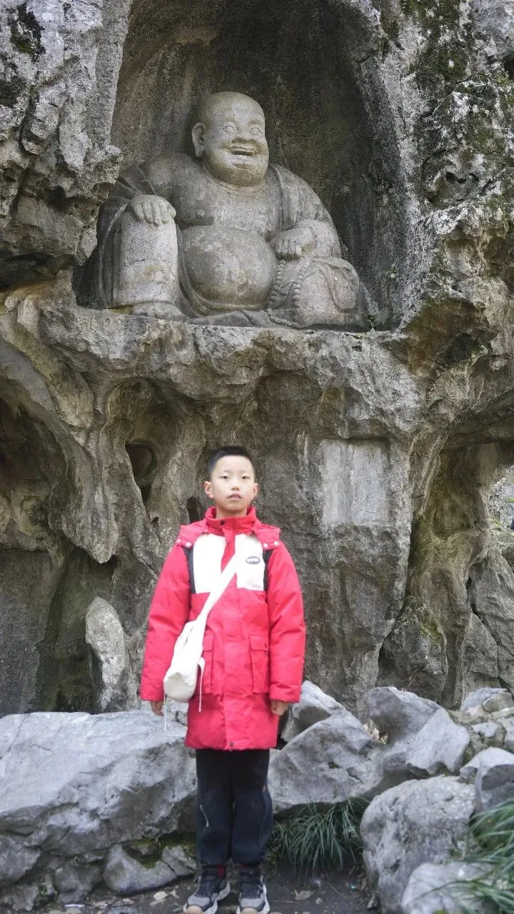 在众多石刻中,最显眼的是一尊弥勒佛像。我指着这尊佛像对爸爸妈妈说,这是飞来峰最有名的造像之一,肚子圆圆的,脸上带着笑容,看起来很亲切,在历史上也确有其人,大肚能容,容天下难容之事,笑口常开,笑天下可笑之人。