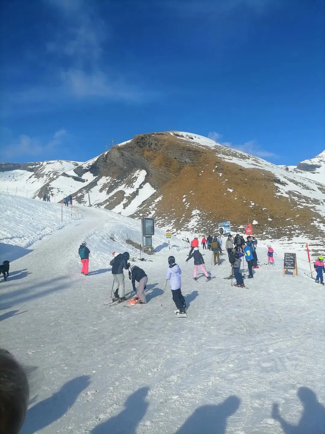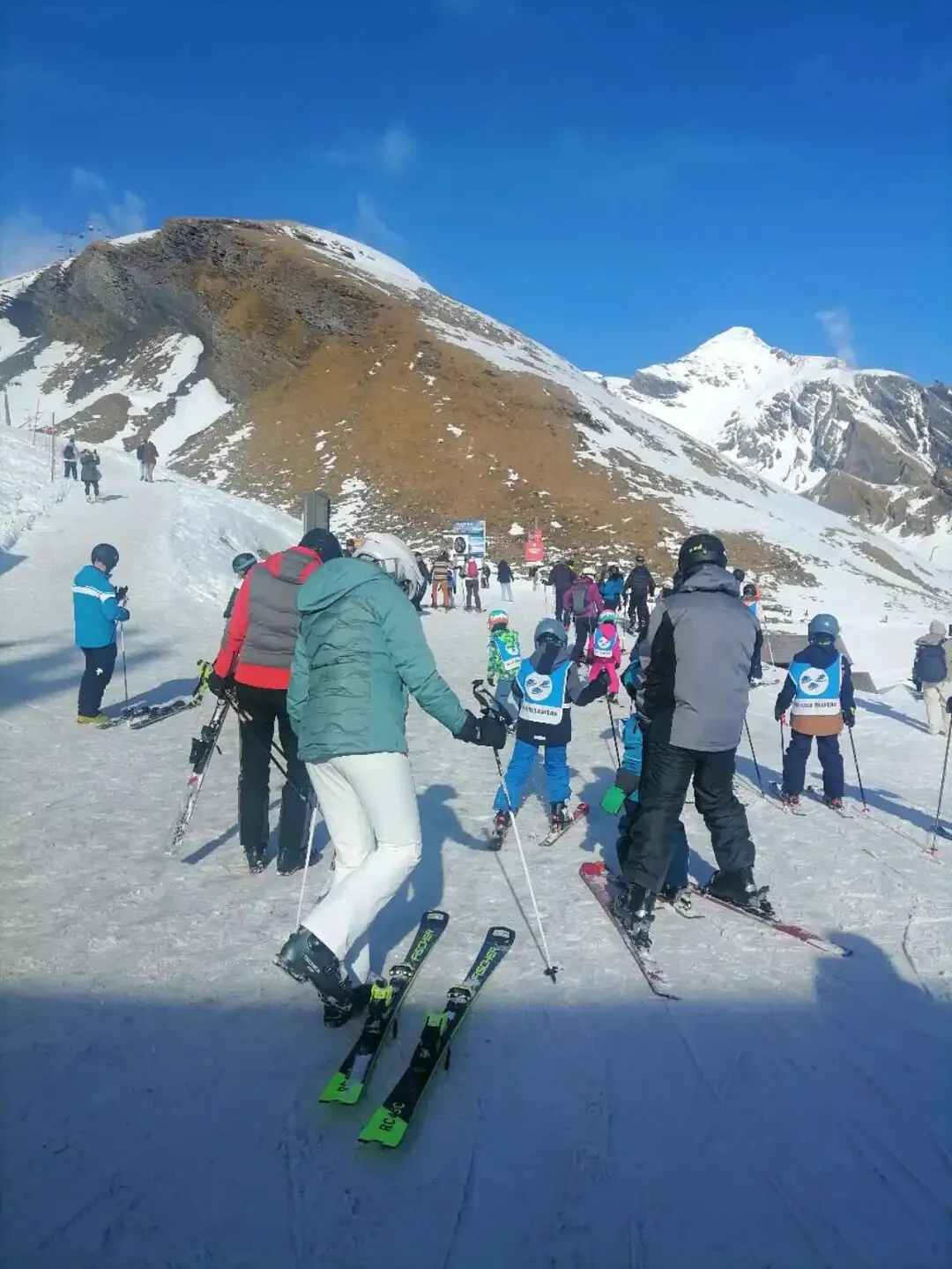 阳光明媚的天气,大人小孩都来了,穿着滑雪衣,脚踩滑雪板,手拿雪橇,进入滑雪道开始滑雪。