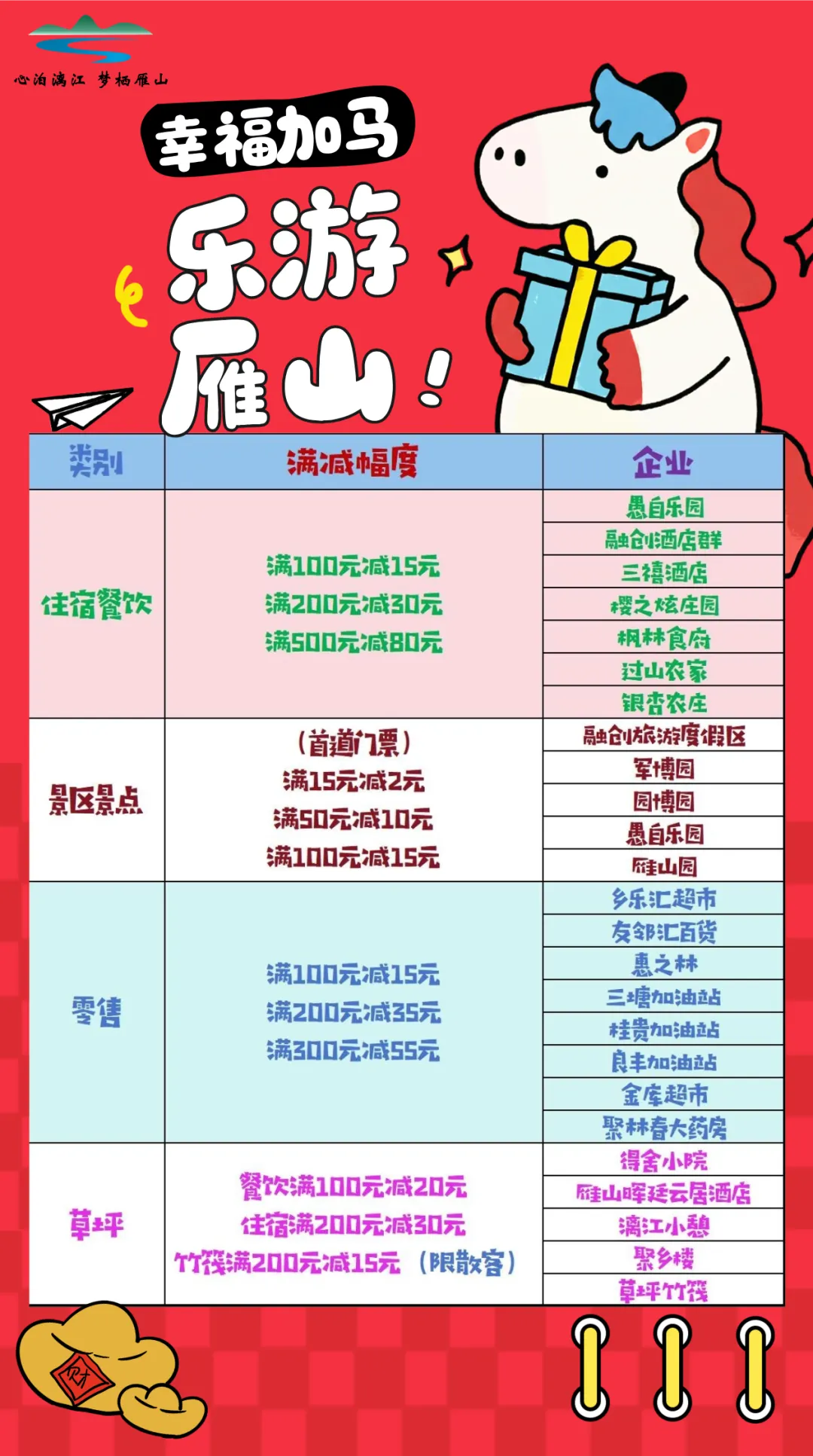 2月8日,记者从雁山区相关部门了解到,为促消费、活市场、提信心,进一步增强2026年春节期间雁山文旅消费市场活力,雁山区将开展“幸福加马 乐游雁山”政府补贴消费券发放活动。 活动计划开展时间为2月12日至3月10日。活动期间,雁山区将向来该区消费的广大市民游客发放8500张各类“满减”消费券,消费补贴金额累计约25万元。 消费券将通过“云闪付”APP进行发放,消费者领券后,可在“好想兑”平台核销使用消费劵。本次雁山区发放的消费劵,可与桂林市市本级发放的消费券,以及商家的优惠券叠加使用。