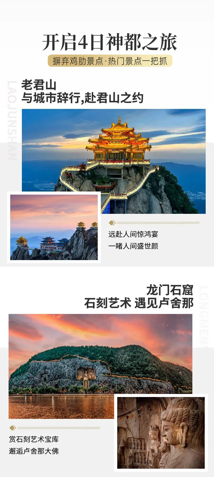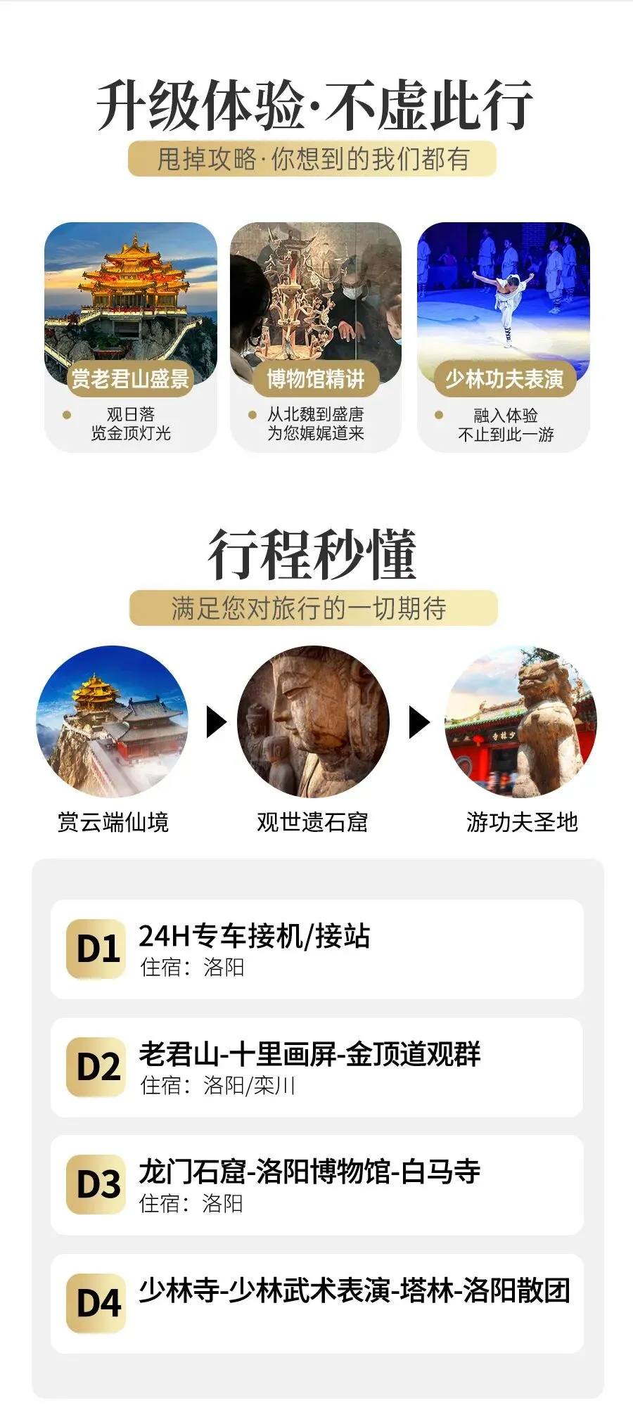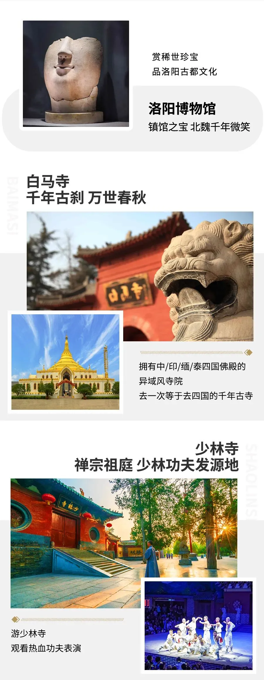 ★ 【贴心赠送】「自营超值」春节不涨价·升级限量·明星导游班期升级2+1航空座椅&儿童赠「早」礼遇 ★ 【缤纷体验】「重磅景区」3大5A景区老君山+龙门石窟+少林寺,4A景区白马寺,洛阳博物馆免预约 ★ 【精选酒店】「盛世洛阳」全程市中心品牌4钻酒店,纯玩无购物,24小时专车接站,管家式导游服务