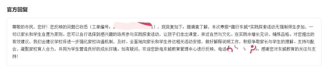 针对该情况,东城教育管理中心公开回复称: 本次寒假“趣行东城”实践探索活动无强制师生参加,一切以家长和学生自愿为原则。您可以自行选择到感兴趣的场所参与实践探索活动,让孩子们走出课堂、亲近自然与文化、在实践中增长见识、锤炼品格。 对您提出的有效建议,我们会建议学校将进一步强化家校沟通机制,及时、全面地向家长和学生传达相关活动安排,做好解释说明工作,积极争取家长与学生的理解、支持与配合,凝聚家校育人合力,共同为学生营造良好的成长环境。