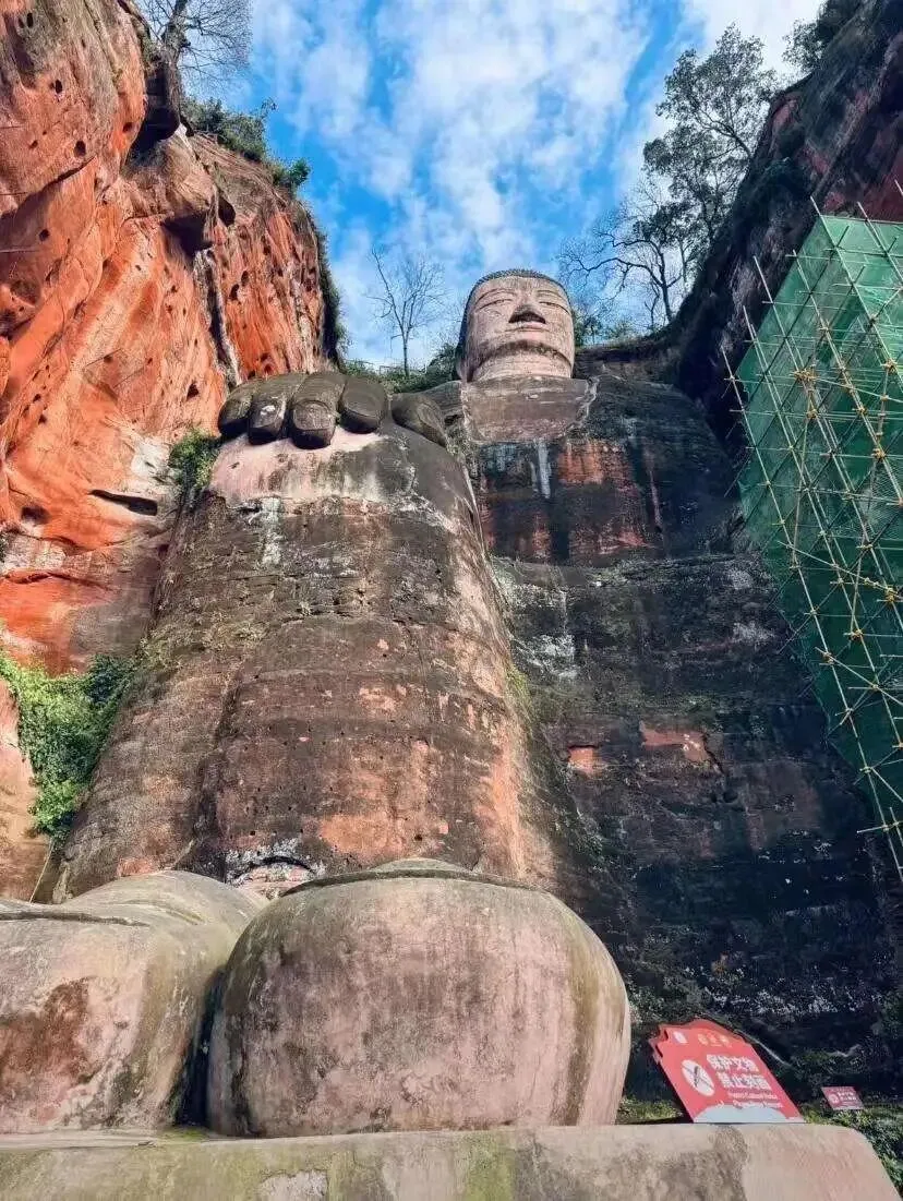 站到佛的脚背上,抬头往上看,.脖子会.酸.。.这佛是.直接在崖壁上凿出来的,唐朝人凿了九十年。江水.就在他脚.边.流,一千多年.了,就这.么看.着。