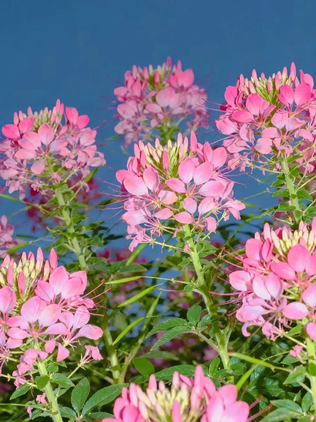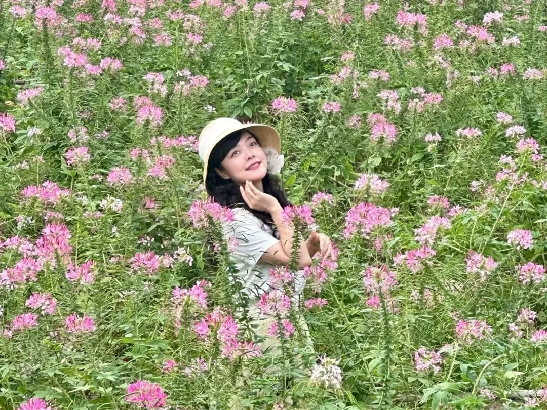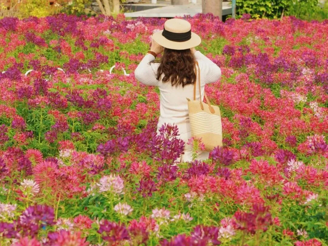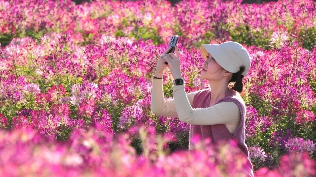 醉蝶花田里,粉白相间的花穗如云似霞