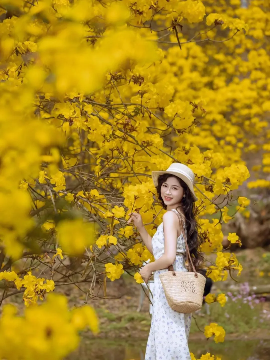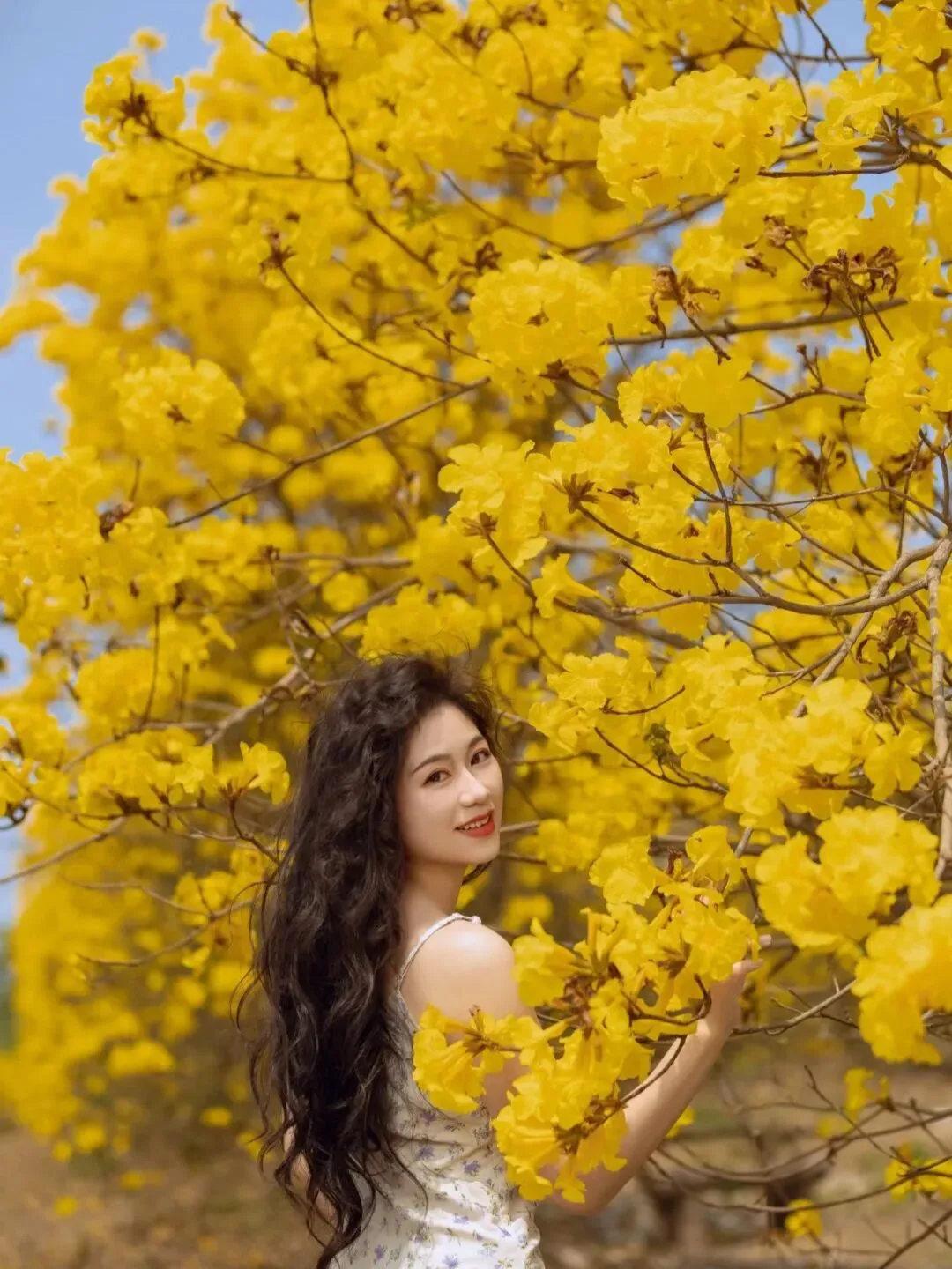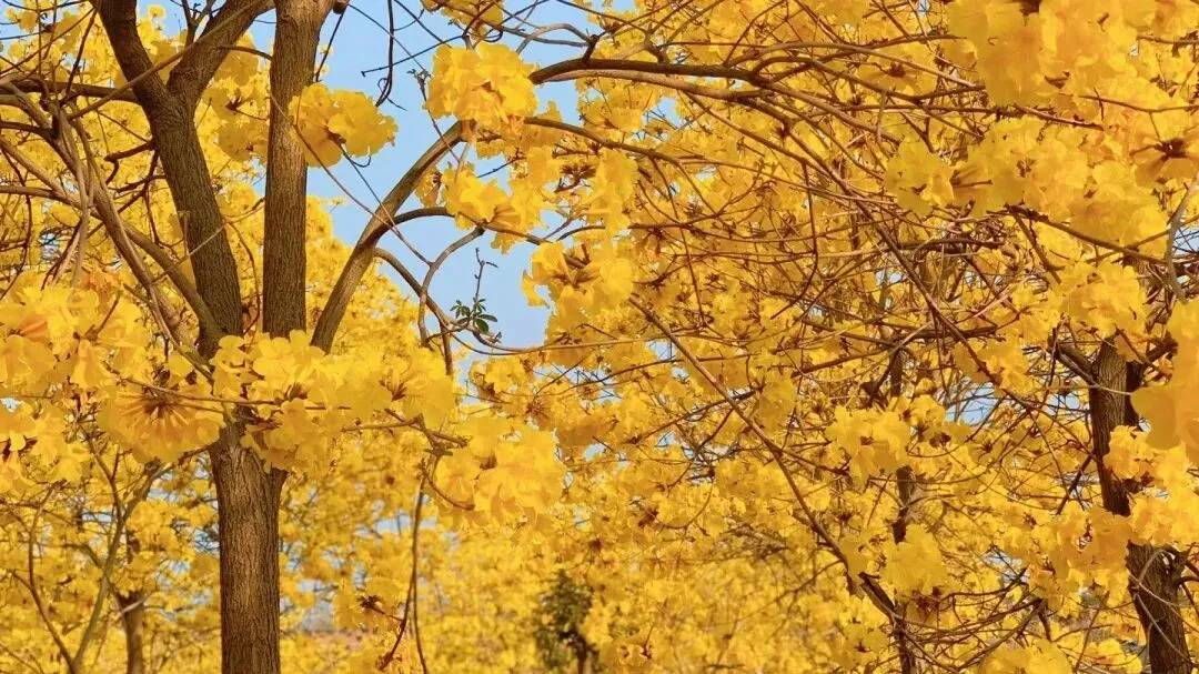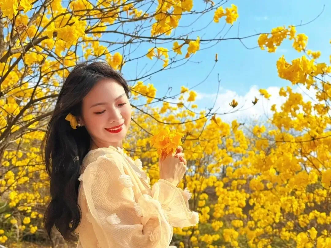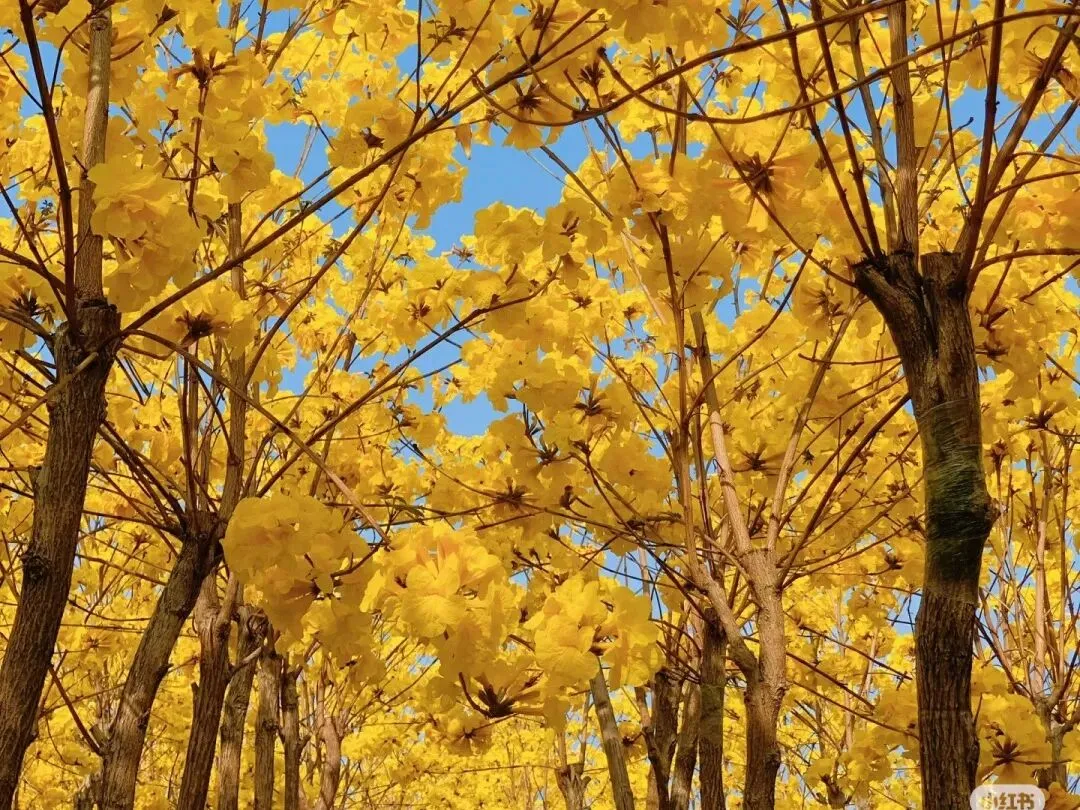 一旁的黄花风铃木正值盛花期,满树金黄不见叶片,像一串串挂在枝头的小灯笼,阳光洒下时金光闪闪,漫步花道,耳畔是风过花枝的轻响,鼻尖是双重花香的交织,随手一拍都是自带柔光的新春氛围感大片,刷爆朋友圈的秘密就在这里~