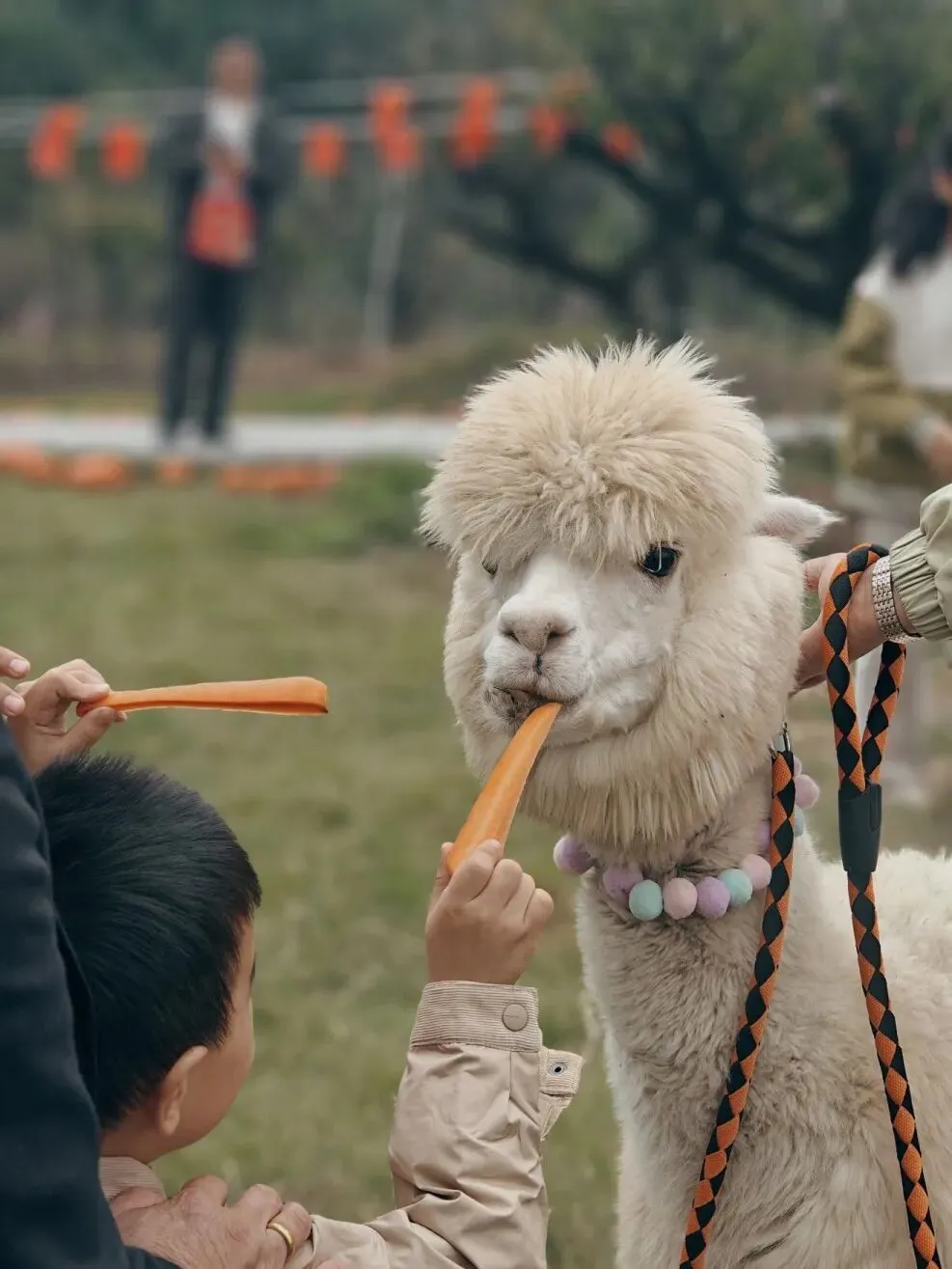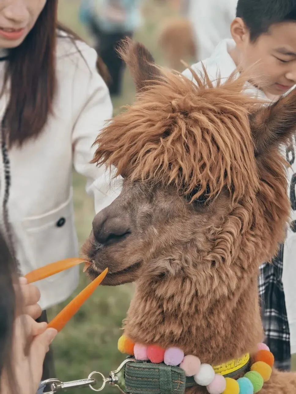 羊驼先生披着蓬松卷曲的绒毛,阳光下绒毛泛着柔光;长长的睫毛下是圆溜溜的大眼睛,时而呆萌地站着咀嚼,时而迈着优雅的步子走到你面前,温顺地接过你掌心的饲料,鼻尖蹭过皮肤带着温温的触感,偶尔还会轻轻打个响鼻,可爱到让人忍不住想摸一摸它柔软的头顶。