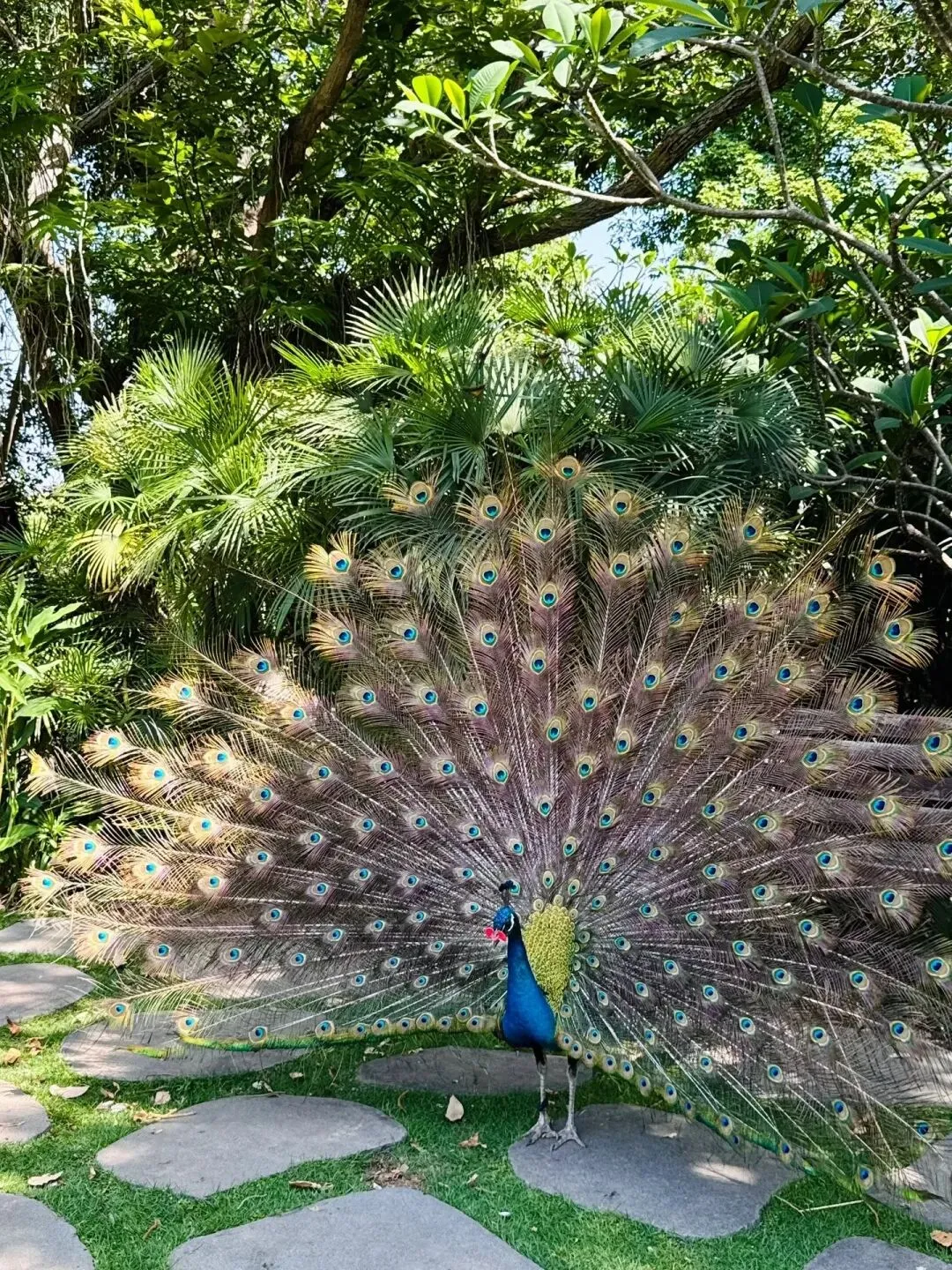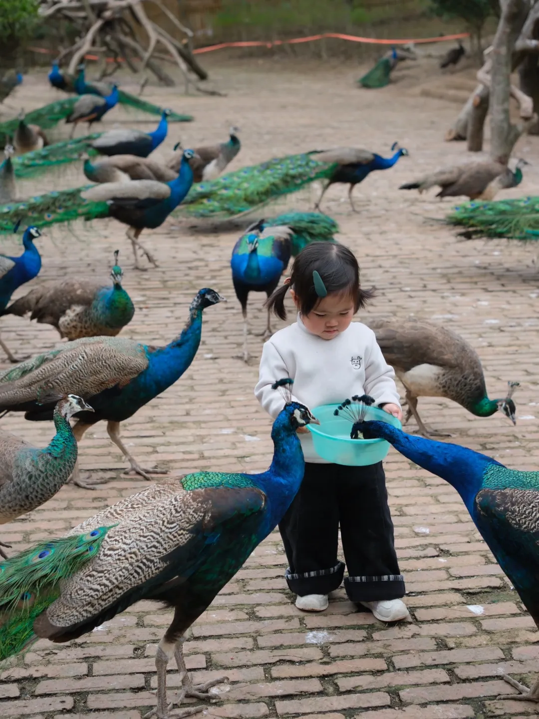 就站在不远处的木架上,拖着长长的尾羽,时而低头梳理华丽的羽毛,时而昂首挺胸来回踱步。若是被你的欢呼声或鲜亮的衣服吸引,雄性孔雀便会突然展开巨大的尾屏,眼状斑纹在阳光下流转着金属般的光泽,开屏的瞬间引得全场惊呼,快门声此起彼伏。
