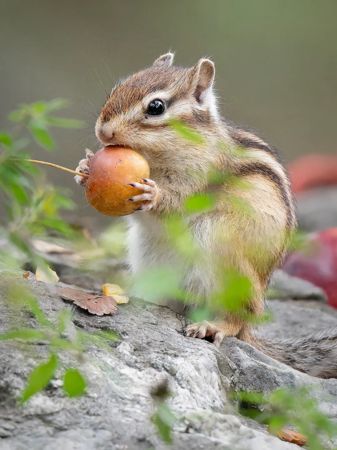 松鼠在林间的木栈道与树枝间灵活穿梭,蓬松的大尾巴像一把小伞,圆溜溜的黑眼睛滴溜溜转,时不时停下来捧着坚果啃食,小爪子快速移动,萌态十足;