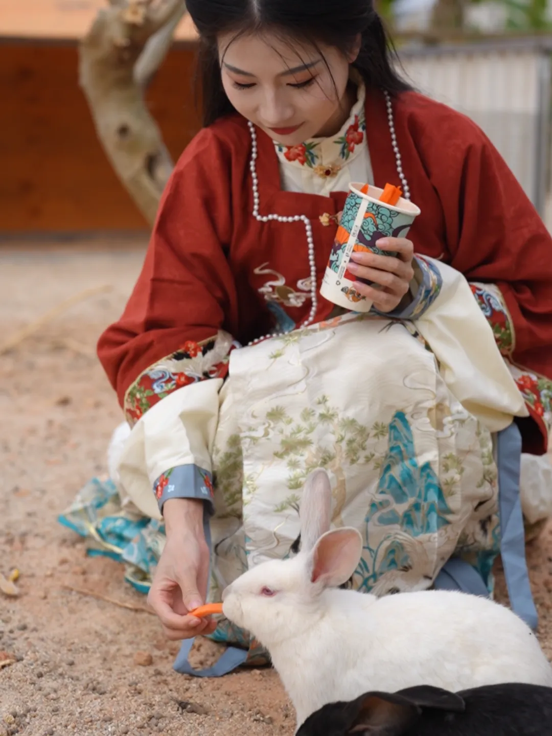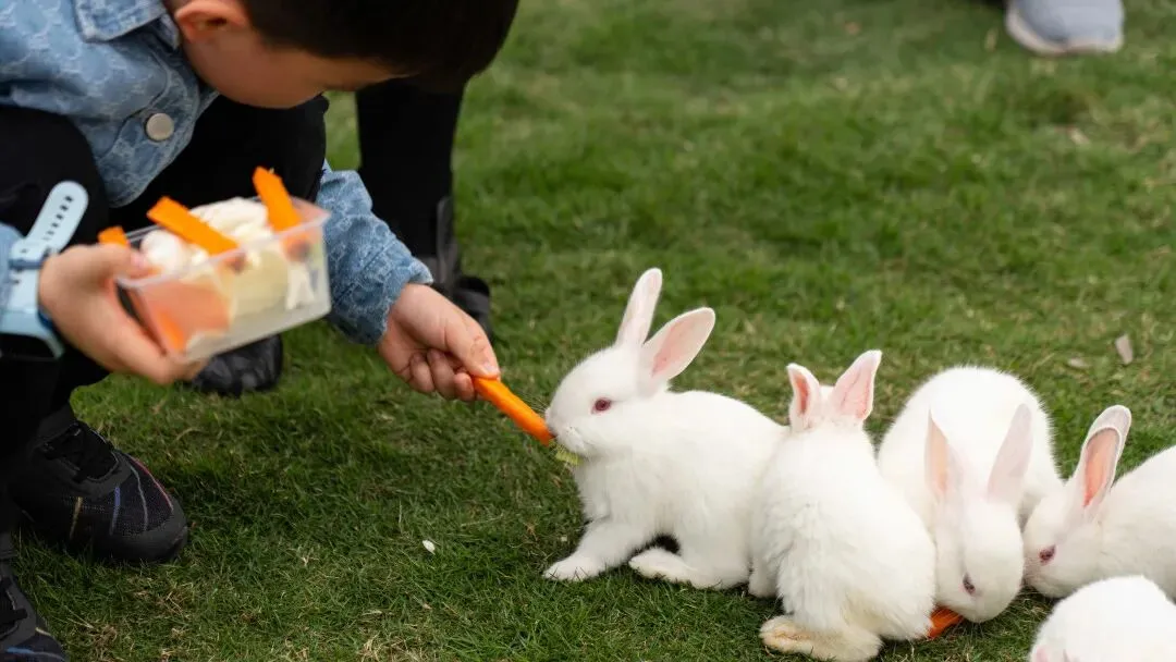 兔子们则在围栏里蹦跳,雪白雪白的绒毛像团棉花糖,长长的耳朵竖得笔直,吃东西时三瓣嘴一动一动,蹲在那里任你抚摸,温顺又乖巧。
