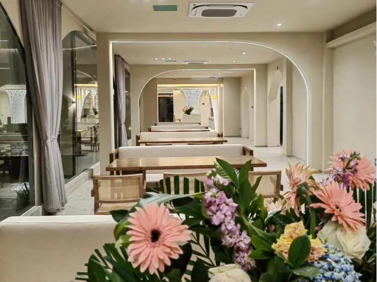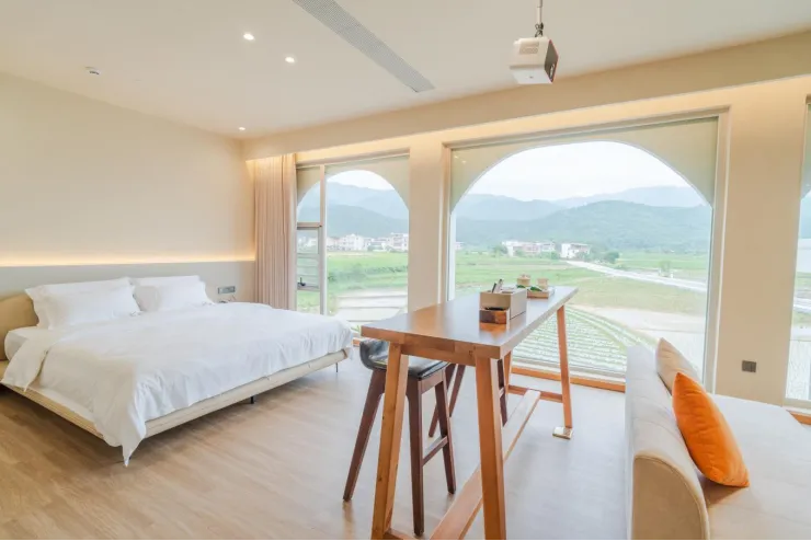 该民宿坐落于九峰山下,由闲置校舍升级改造而成,是一个集住宿、会议、餐饮、休闲于一体的高端综合体。其建筑以奶白色与原木色为主调,风格简约,与周围的田园山水和谐相融。主题客房配备超大落地窗,设有“天空之境”观景台可静观星河,庭院草坪可承接各类定制活动。民宿每周更新手工体验项目,让游客深度感受在地文化。