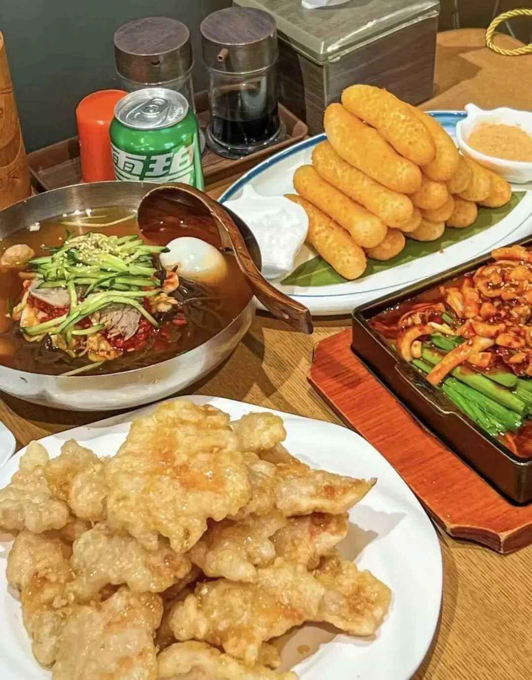 没错,大冬天吃冷面。酸甜爽口,加上冰碴子……第一口会怀疑人生,第二口就上头了。配着辣白菜、烤肉串,绝配!