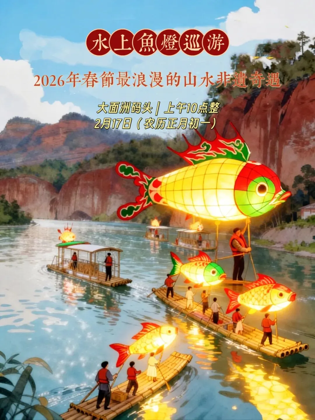 10:00 | 鱼灯巡游:2月17日(农历正月初一),在大面洲码头开启百米鱼灯水上大巡游,12艘鱼灯竹筏队如《大鱼海棠》般破雾而来 。
