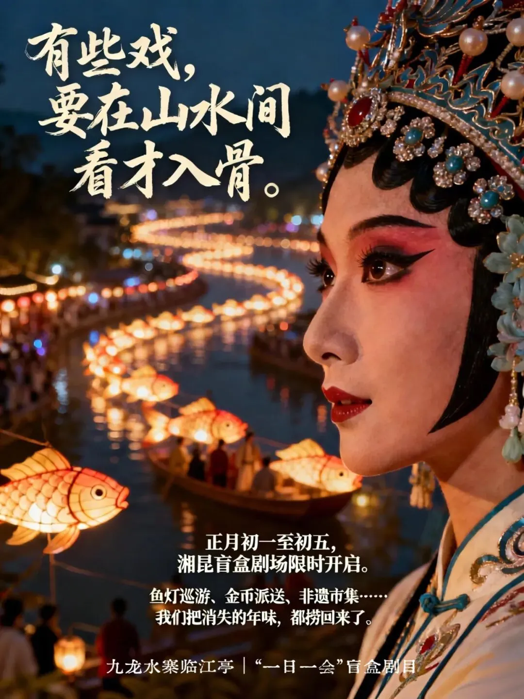 10:30 | 湘昆盲盒:2月17日-2月21日(农历正月初一至初五),在九龙水寨临江亭的纱幔雾气中,每天掉落不同剧目《游园惊梦》、《醉打山门》等 。