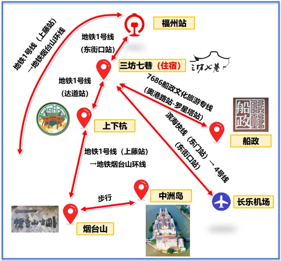 路线规划:住宿→7686船政文化旅游专线(船政站)→船政文化景区→返程