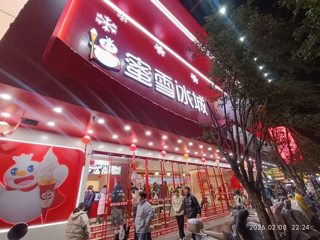 步行街口,一家面积巨大的蜜雪冰城,火红火红,让人忍不住驻足观望。椰子看到蜜雪冰城,就吵着要吃冰淇淋。