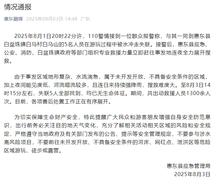 2025年8月1日20时22分许,110警情接到一位群众报警称,与其一同到惠东县白盆珠镇白马村白马山的5名人员在游玩过程中被水冲走失联。接警后,惠东县应急、公安、消防、白盆珠镇政府等部门组织专业救援力量展开搜救。