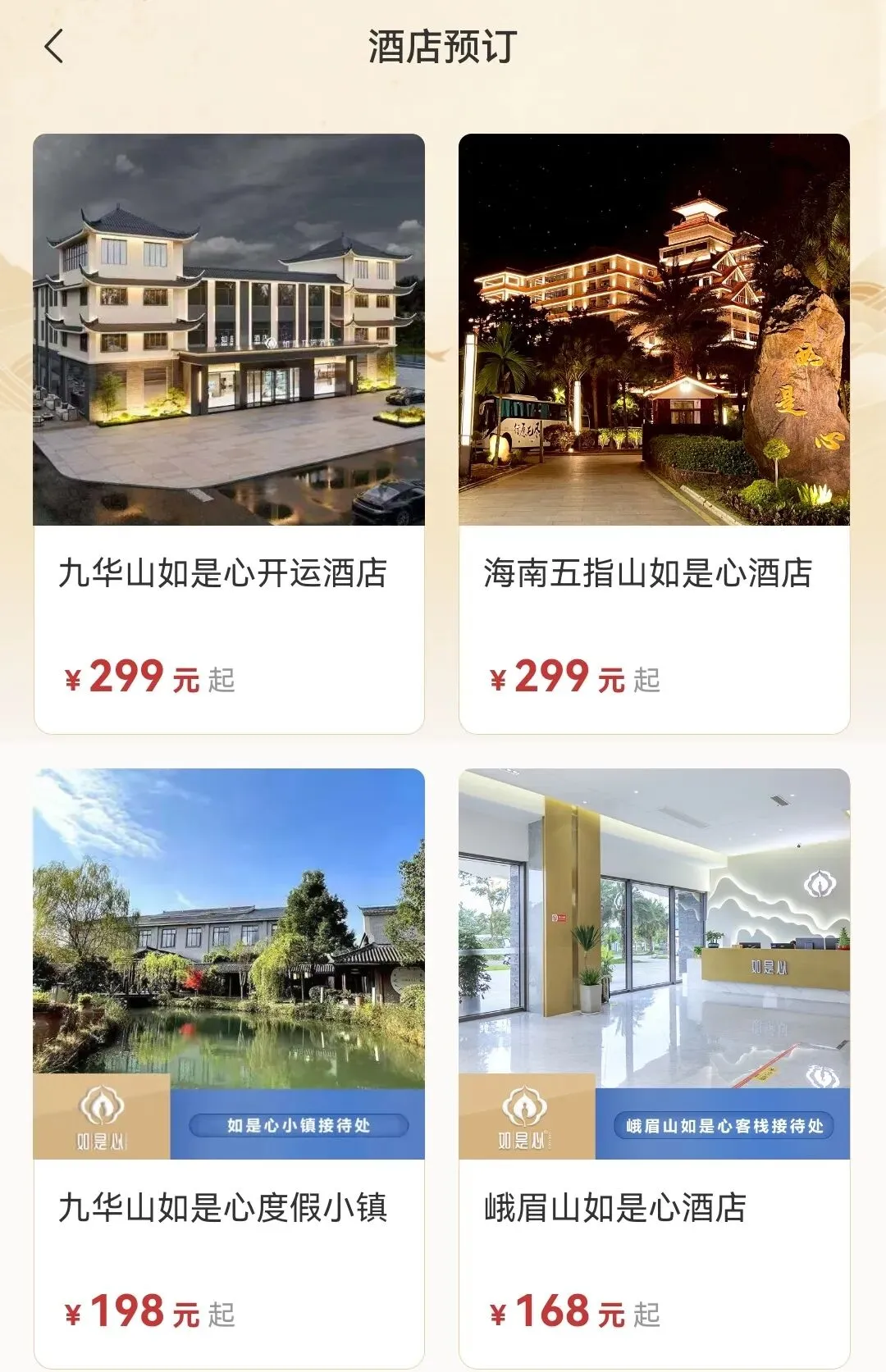 如是心目前在九华山、普陀山、峨眉山、黄山、大理、海南五指山、安吉等地均有开设。下面是各酒店的缩略图。