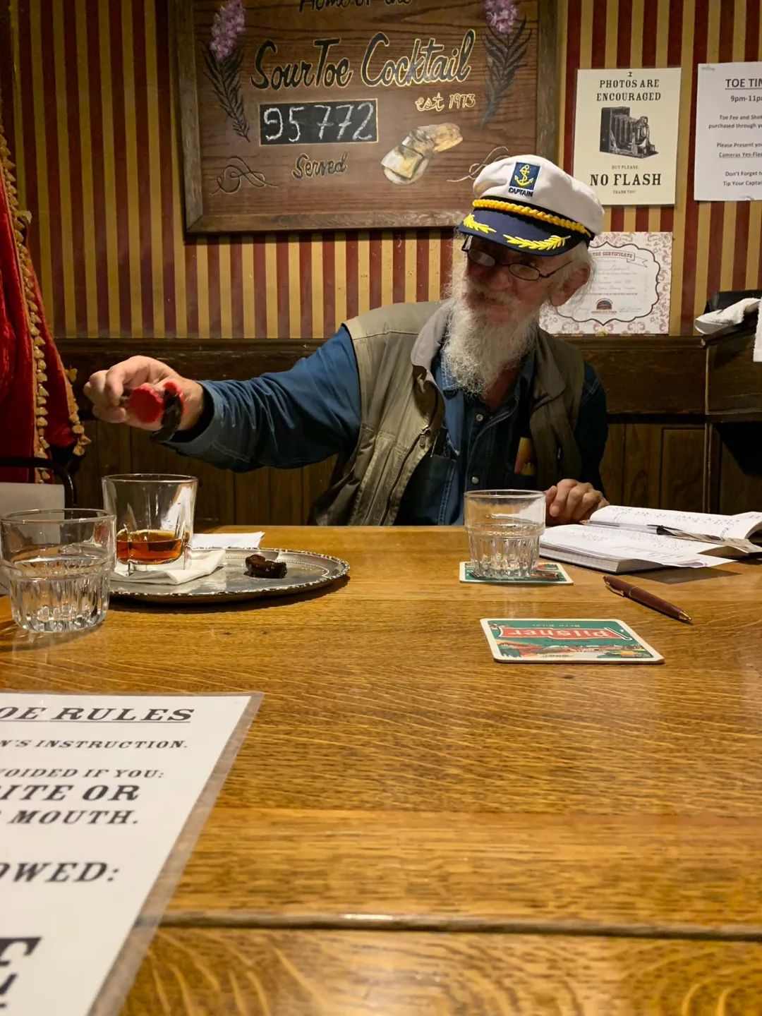 在道森,最惊世的体验就是“酸脚趾挑战” —— 只要你敢喝下里面装有酸脚趾的烈酒,就能得到一本证书。全球已经有超10万人参与并获得了这张证书。