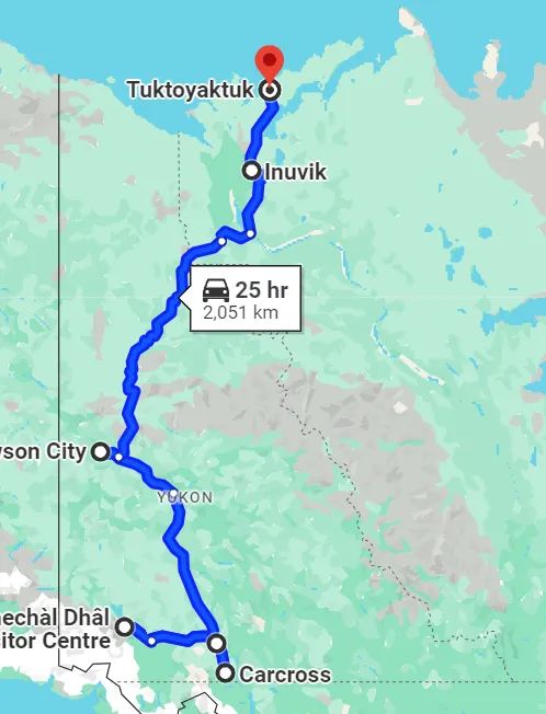 如果你有非常充裕的时间,那么可以从温哥华、甚至从多伦多出发,一路向北抵达北冰洋小镇、位于西北领地的图克托亚图克(Tuktoyatuk),距离在4000公里左右。