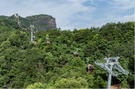 八角寨新索道采用的是世界顶尖的客运索道系统,全程1200米,55个吊厢,每个吊厢可坐8人,每秒运行速度3米,日客运量12800人。