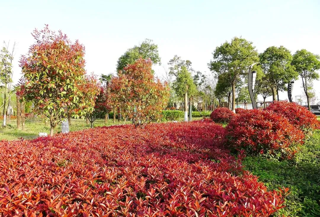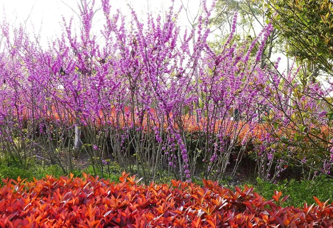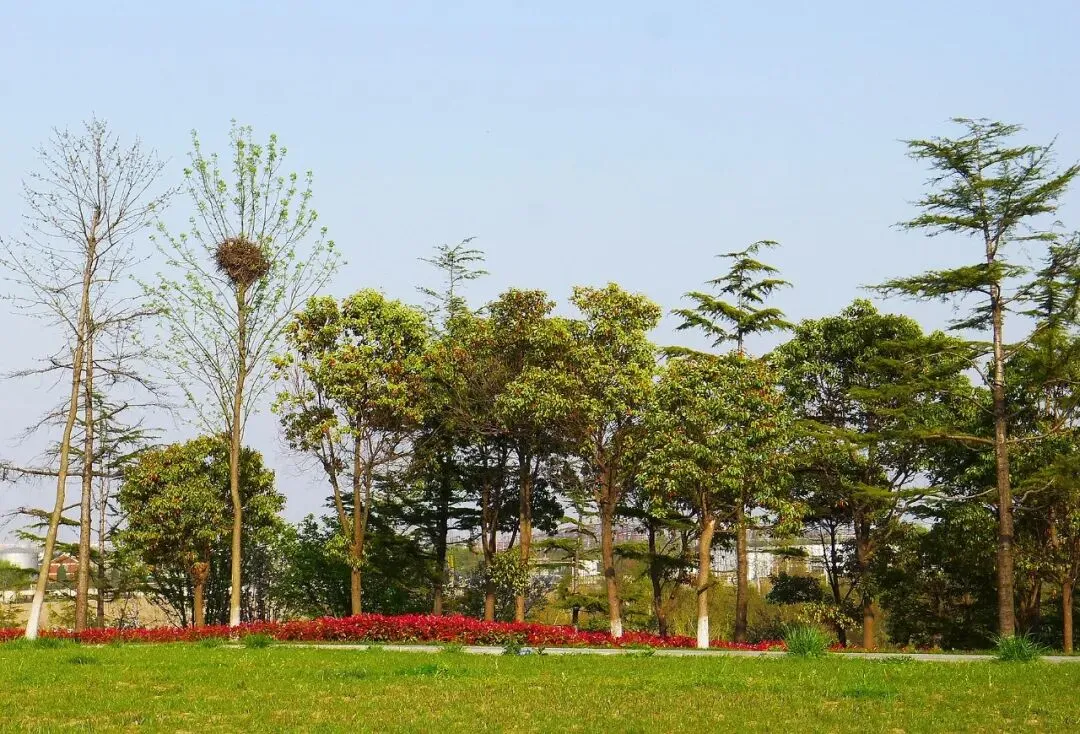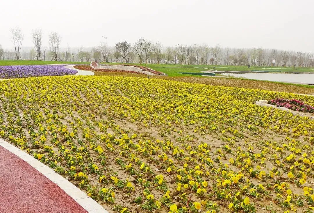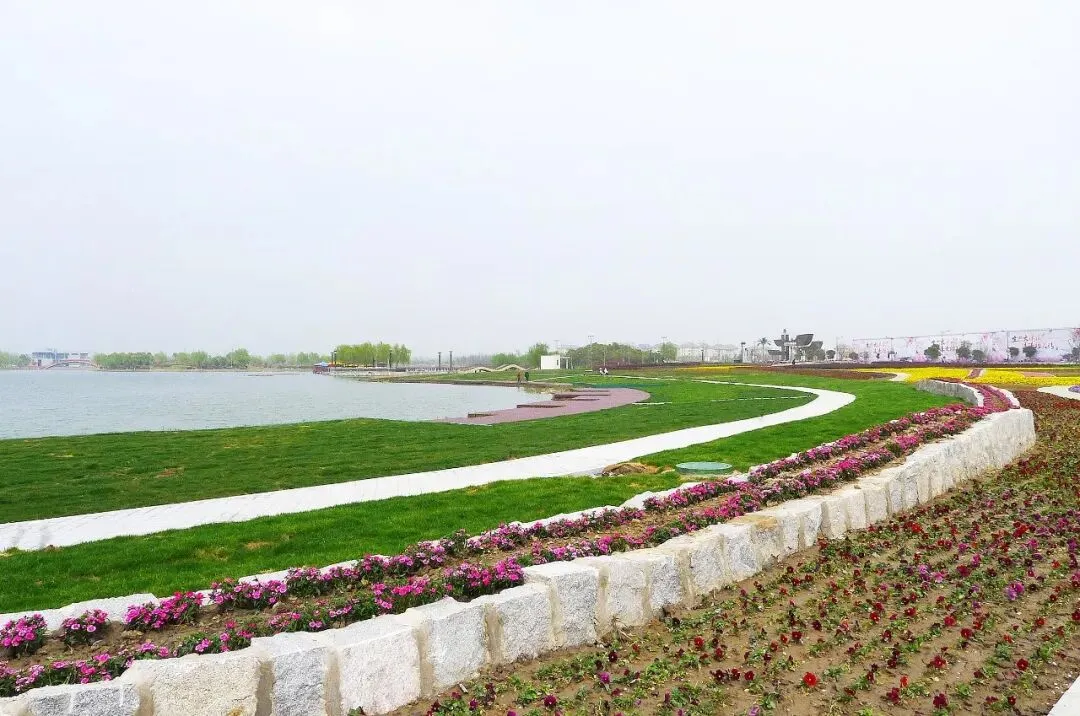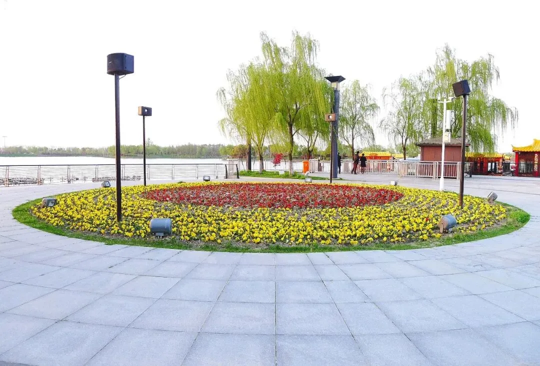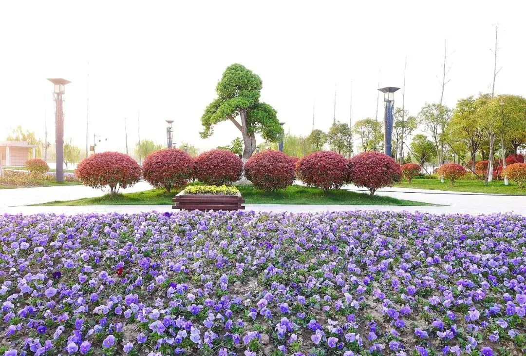大洋湾花池里的花有黄的、红的、紫的、粉的,色彩纷呈。远处水面腾起水雾,树木显得朦朦胧胧。在小径上散步,可欣赏花池里的花,也可看看远处的绿树,空间广阔,令人心旷神怡。