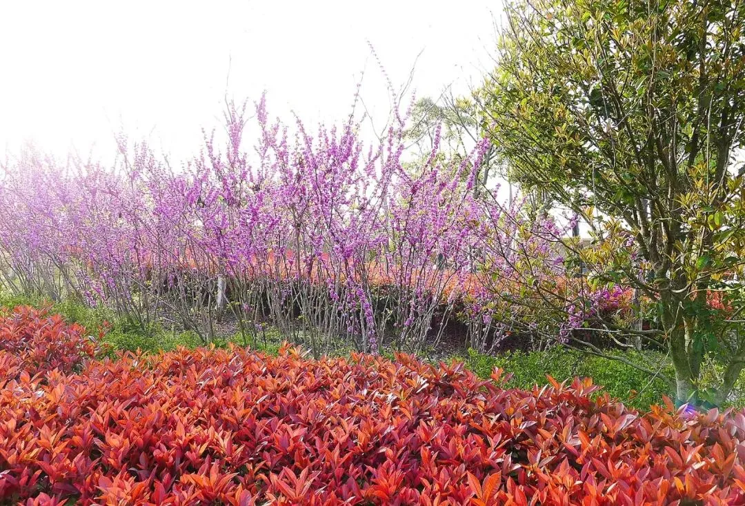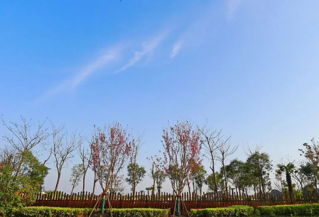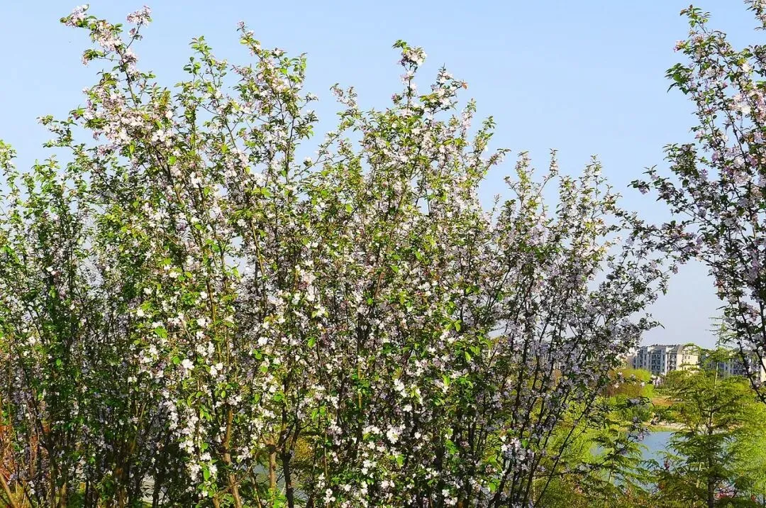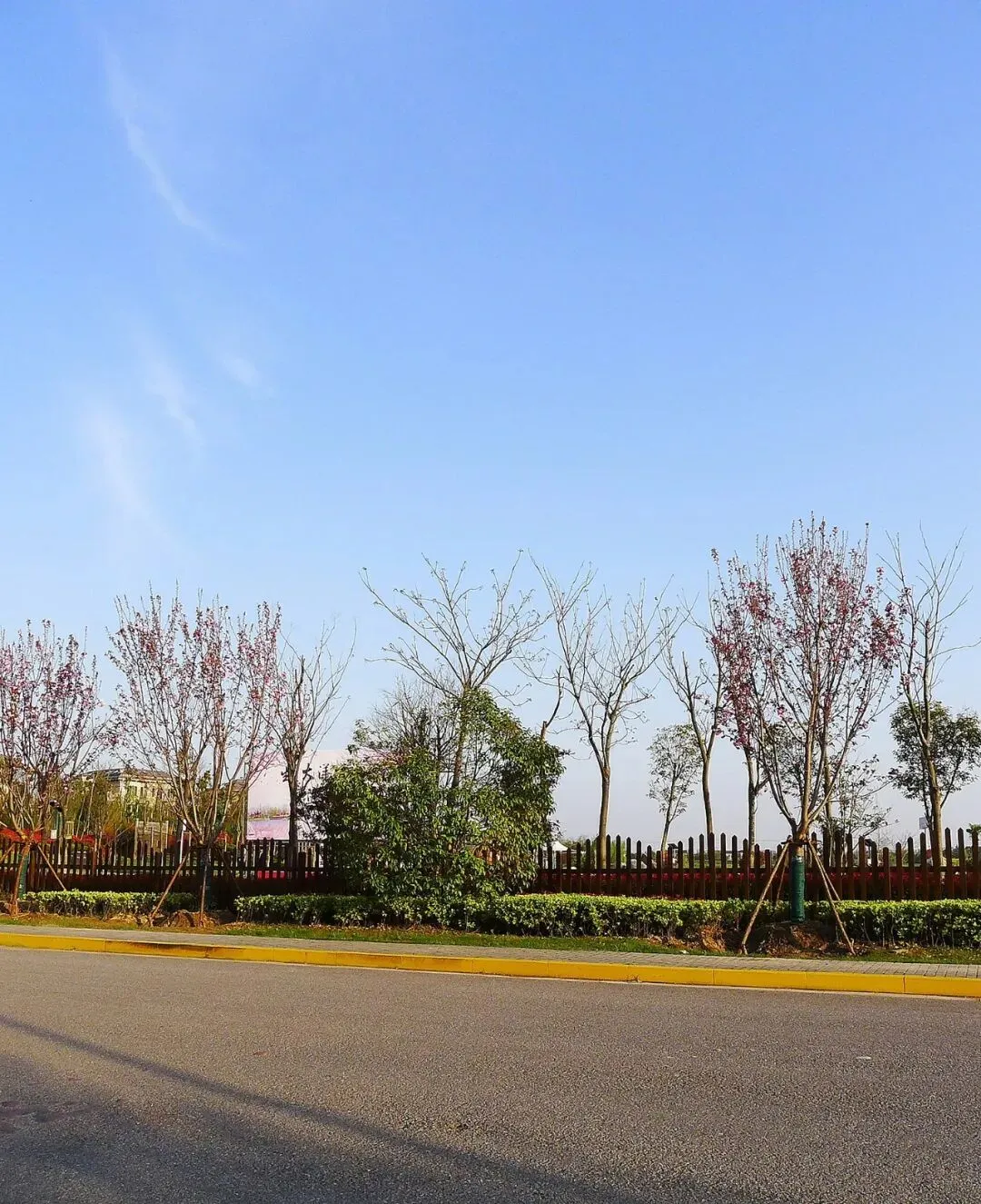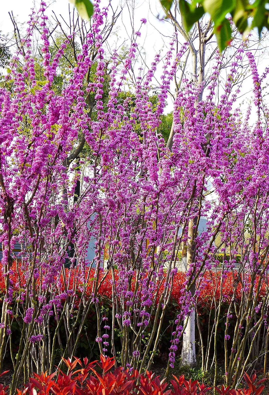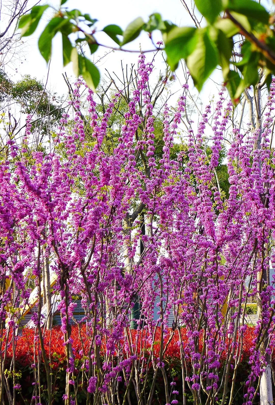 大洋湾花池里的花有黄的、红的、紫的、粉的,色彩纷呈。远处水面腾起水雾,树木显得朦朦胧胧。在小径上散步,可欣赏花池里的花,也可看看远处的绿树,空间广阔,令人心旷神怡。