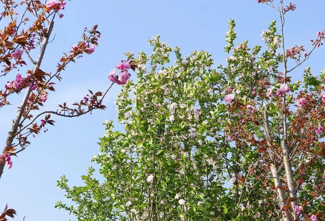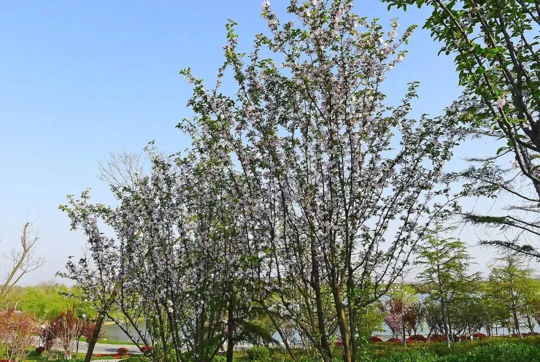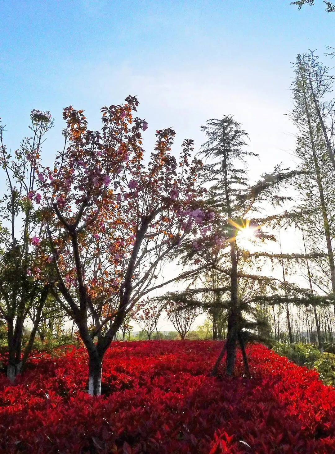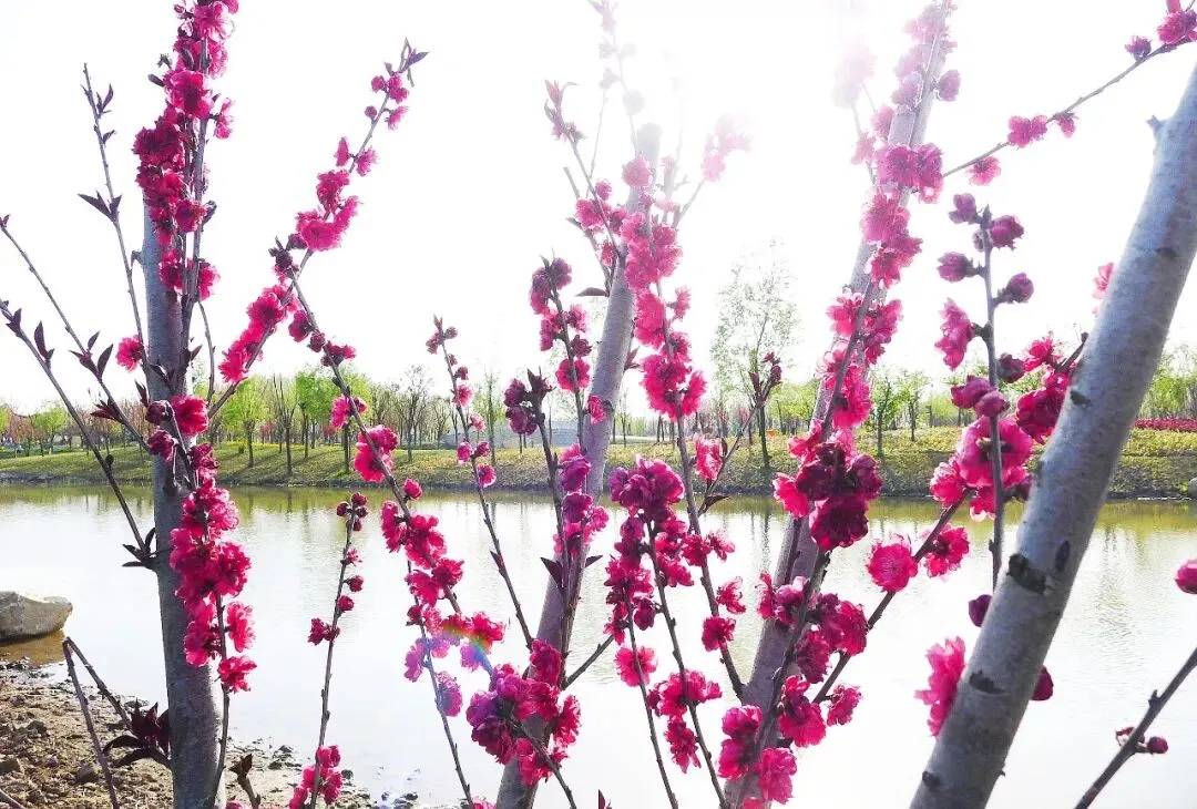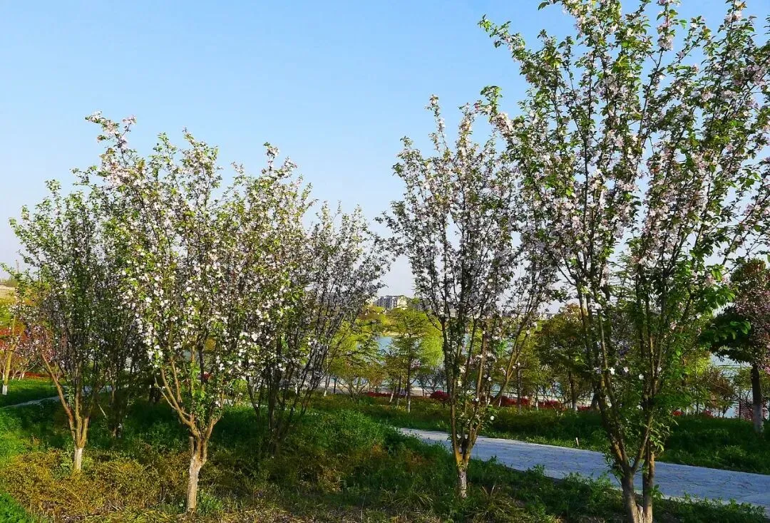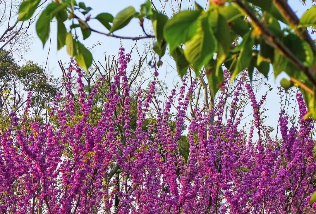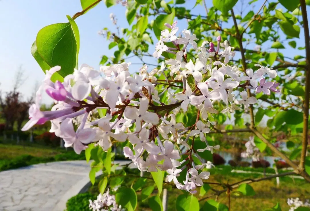 大洋湾花池里的花有黄的、红的、紫的、粉的,色彩纷呈。远处水面腾起水雾,树木显得朦朦胧胧。在小径上散步,可欣赏花池里的花,也可看看远处的绿树,空间广阔,令人心旷神怡。