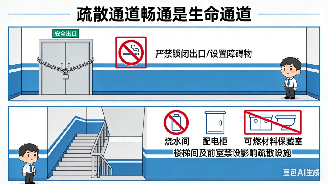 安全出口、疏散通道必须24小时保持畅通,严禁堆放易燃可燃物品、锁闭出口或者设置障碍物,楼梯间及前室内也不能设置烧水间、配电柜、可燃材料储藏室这些影响疏散的设施。