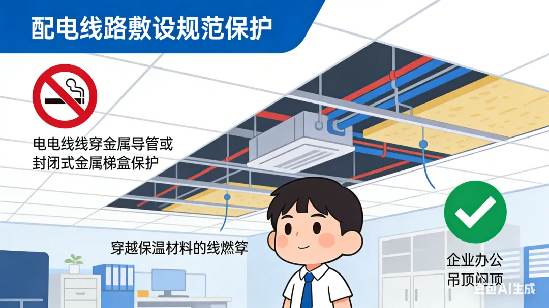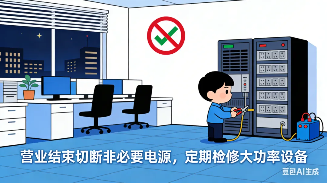 电气线路敷设和设备安装要符合标准,不能私拉乱接、擅自增加用电设备,配电箱也不能出现零地并接违规情况。配电线路敷设在闷顶、吊顶内的,要穿金属导管或封闭式金属槽盒保护,穿越保温材料的要穿阻燃管。每天营业结束后,要及时切断非必要电源,定期对大功率用电设备和线路进行检修,防止超负荷运行。还有一点要重点强调,观光车、电瓶车、个人电动自行车及其蓄电池,绝对不能在公共门厅、疏散走道、楼梯间、安全出口这些地方停放、充电,也不能私拉电线充电,要在指定安全区域充电。