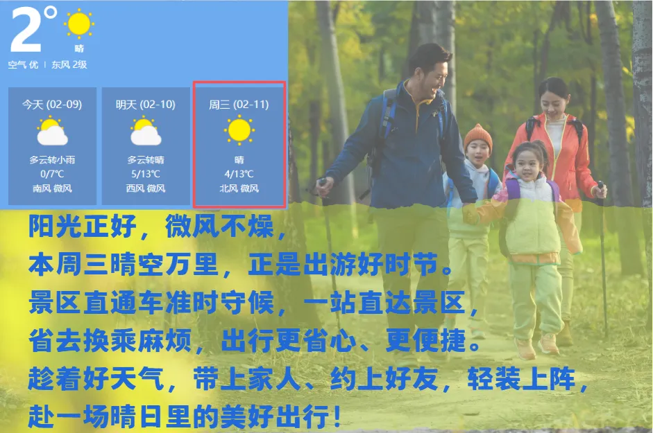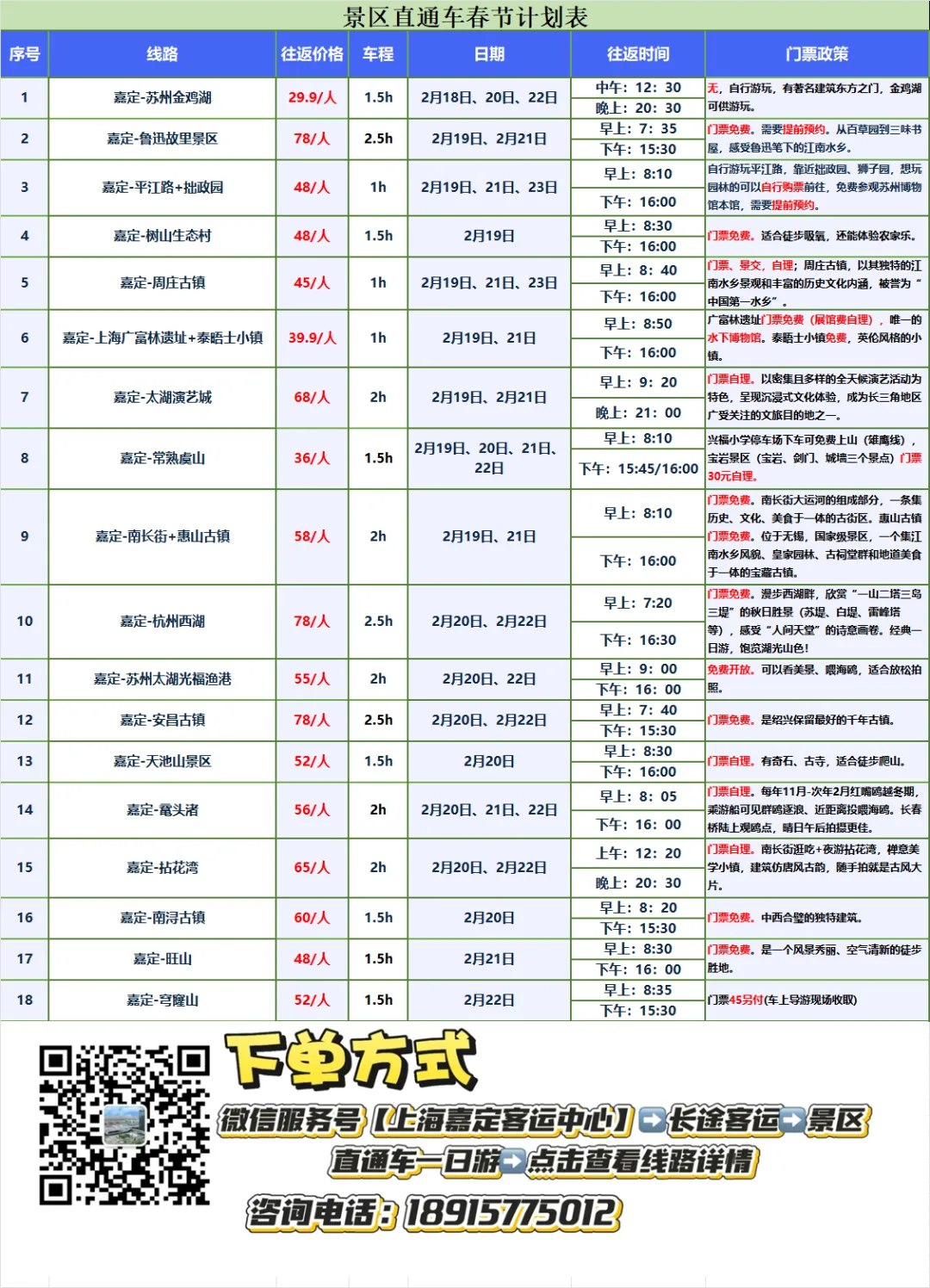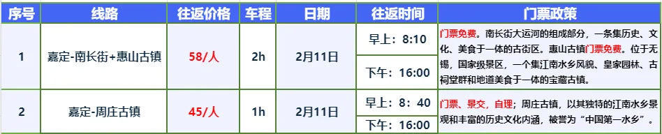 您现在的位置是:首页 > 国内旅游目的推荐 > 正文 国内旅游目的推荐 【景区直通车】周三晴好不宅家,直通车邀您一起出发去玩! admin2026年02月09日 18:09:49国内旅游目的推荐9 【景区直通车】周三晴好不宅家,直通车邀您一起出发去玩!本周三(2月11日)线路2026年春节期间线路景区直通车线路和班次日期持续更新中,请保持关注哦!购票规则【免票(携童)】每一名成人旅客可免费携带一名6 周岁(含)以下或身高 1.2 米(含)以下且不单独占座的儿童。超过一名或需单独占座时,超过人数需购买半价票。【半票】6-14 周岁或身高 1.2-1.5 米的儿童需购买半价票,并提供座位。景区直通车上海嘉定客运中心服务号来源:上海嘉定客运中心编辑:高田蕾 转载请说明来源于"旅荐网",部分内容转载自网络,如有侵权请联系qlwl@foxmail.com删除 本文地址:https://www.15386.cn/post/98989.html 上一篇 自治区巡导组深入旗文化旅游广电局调研指导“不忘初心 牢记使命”主题教育工作 下一篇 从南北极到长城内外,旅游人共祝中国旅游协会四十华诞 相关文章 研学&旅行行前指南 | 红庙之约,解锁非遗之旅 2026法国旅游签证全攻略|手把手教你搞定申根签,浪漫之旅说走就走! 毕节市全域旅游攻略上线啦!这份超全吃住攻略请收下! 安徽省蚌埠旅游攻略 | 淮河明珠,千年珠城的诗意之旅 最新消息!合肥春假游玩攻略来了 珠海旅游攻略,保姆级分享推荐 香港旅游攻略小红书广告上线 3月22日镇江·永州足球友谊赛系列攻略(游玩美食篇) 收藏!毕节全域旅游攻略 H5 上线,吃住行游购娱一键搞定 歙县长陔乡游玩全攻略→玩遍四季烟火,遇见最美深山 发表评论 取消回复 评论列表 这篇文章还没有收到评论,赶紧来抢沙发吧~