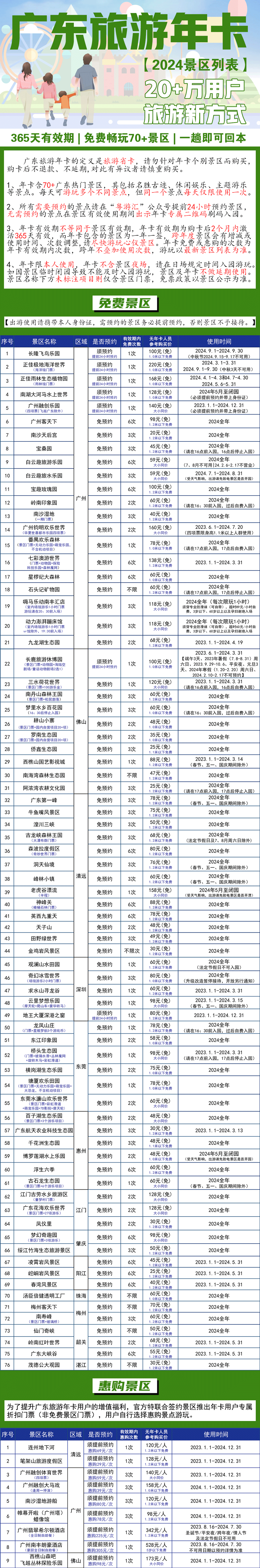 2、大部分的景区全年均可不预约、不限次使用,个别景区有使用时间、次数限制或须预约,出游前请查看“粤游汇”微信公众号年卡公告;年卡内包含的大部分景区1.2米(不含)以下儿童免票,详见景区列表说明,年龄太小的孩子请自行考虑是否购买。