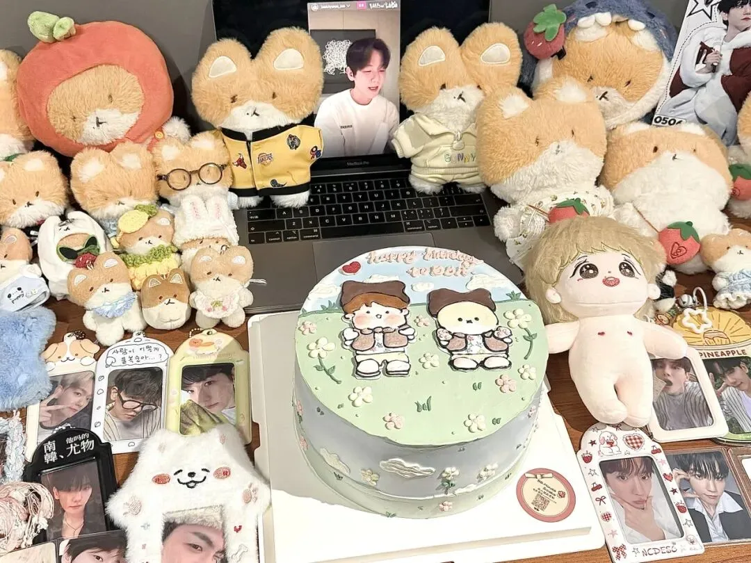 这是一次生日会,所有的粉丝聚在一起庆祝生日,这里面有很多娃娃,每一个都是他的主人精心打扮的,比如穿着精美衣服的、戴着可爱帽子的、还以及戴眼镜的,中间那个穿着黄色衣服的是我的娃娃,他站在C位与大家一同庆祝生日,每个娃娃都是用心装扮的,每个娃娃都来自不同的地方,但是每个娃娃都是一家人。