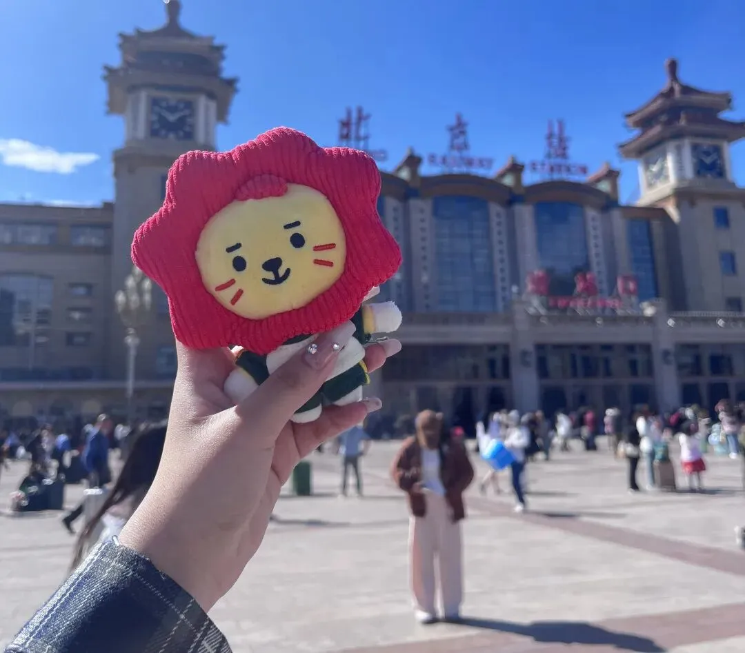 凌晨的沈阳站,我带着莱阳玩偶和硬座票,踏上开往北京的夜车。到了北京站,我举着它定格了这张照片,留存专属纪念。夜晚场馆里荧光海翻涌,它随我一起接住王源每一句温柔。散场晚风微凉,它陪着我赶路,满心都是踏实,这趟奔赴热爱的旅程,我们一起圆满了。