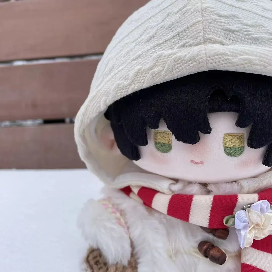 雪慢悠悠飘着,落在娃娃的连帽上,红白围巾裹着他的小脖子,看着软乎乎的。我把他放在雪地里的木椅旁,手指轻轻碰了碰他衣角的小花,就好像他真的陪着我看雪一样,心里安安静静的,连冬天的风都好像不那么冷了。