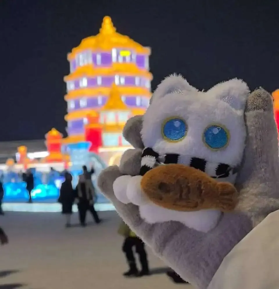 这只抱鱼小玩偶,是我冰雪大世界之行的专属旅伴。寒夜里,我捧着它站在冰雕玉琢的天地间,一同凝望鎏金泛紫的冰塔在夜色中熠熠生辉。掌心贴着软乎乎的绒毛,暖意抵过周遭的凛冽,细碎的光影落在玩偶身上,也落在心底。它成了这场冬日奔赴的温柔印记,是我北国回忆里最软的那一抹温度。