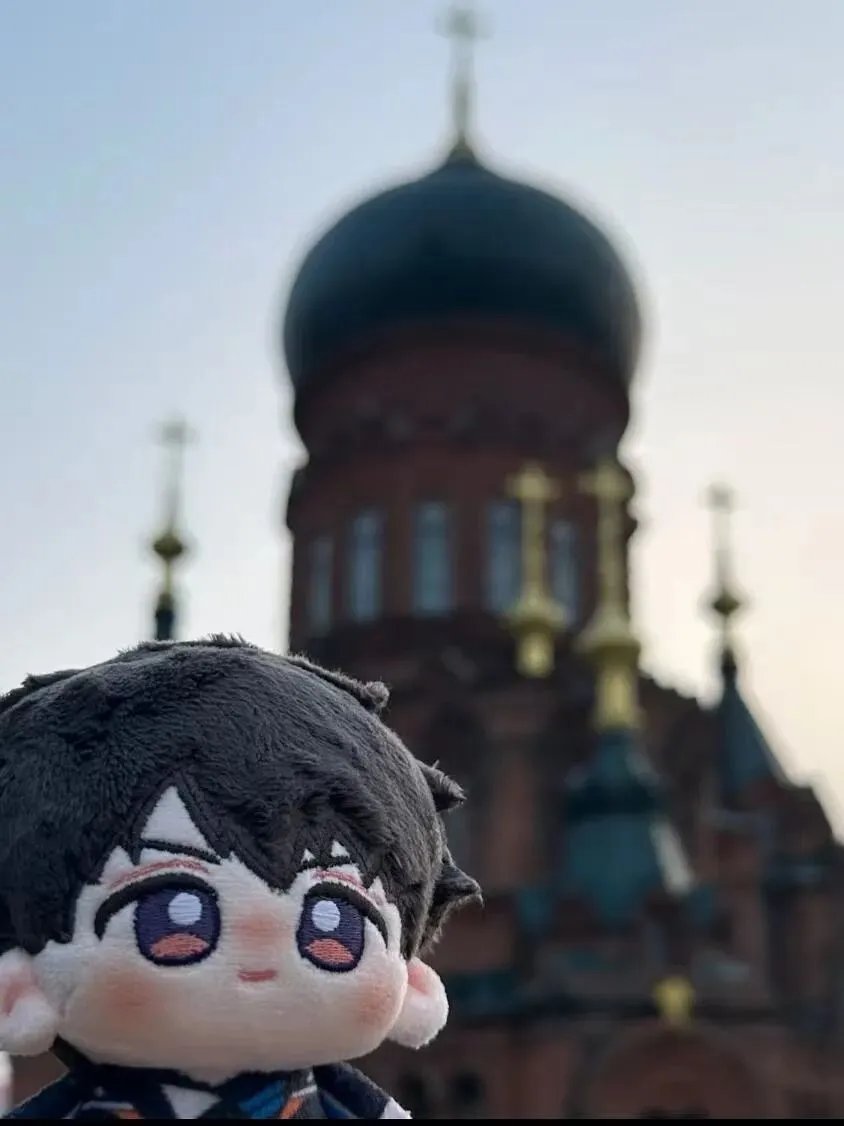 哈尔滨的风总带着冰碴子,我攥着怀里的玩偶站在索菲亚教堂前。砖红色穹顶在暮色里泛着暖光,和他软乎乎的脸颊温度刚好呼应。去年冬天我独自返乡,在中央大街的小店一眼相中了这个小家伙。此刻他圆溜溜的眼睛望着洋葱头穹顶,像陪着我重温童年:小时候总缠着奶奶买红肠,如今带着玩偶站在同样的地方,风还是冷的,心里却被填得很满。