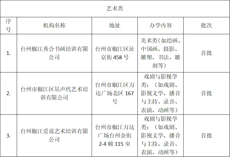 为贯彻落实中央办公厅、国务院办公厅《关于进一步减轻义务教育阶段学生作业负担和校外培训负担的意见》精神,进一步强化校外培训机构监管,加大校外培训机构信息公开力度,按照《台州市“双减”工作专班关于进一步做好校外培训机构“白名单”管理工作的通知》(台双减专班〔2023〕2号)要求,区文化和广电旅游体育局开展校外培训机构“白名单”认定工作。现将2026年艺体类校外培训机构“白名单”公布。