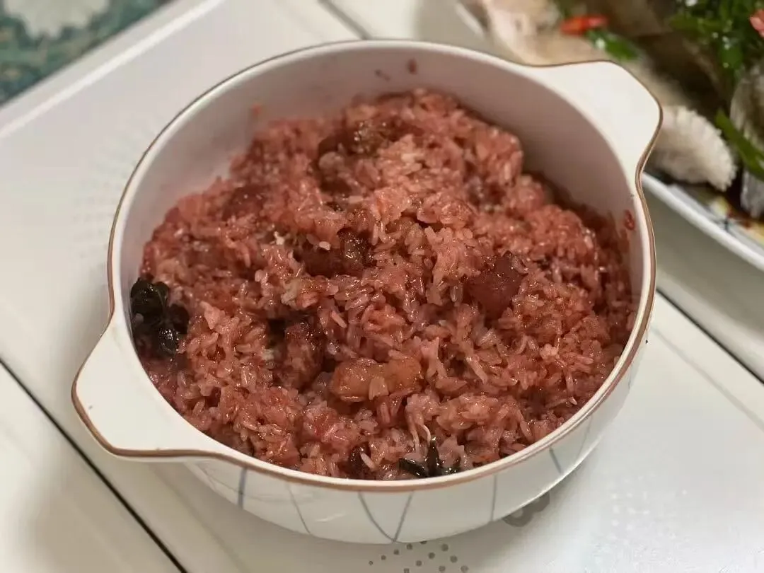 五花肉切厚片,裹上红曲米粉,加酒酿、香料,和糯米一起蒸透。