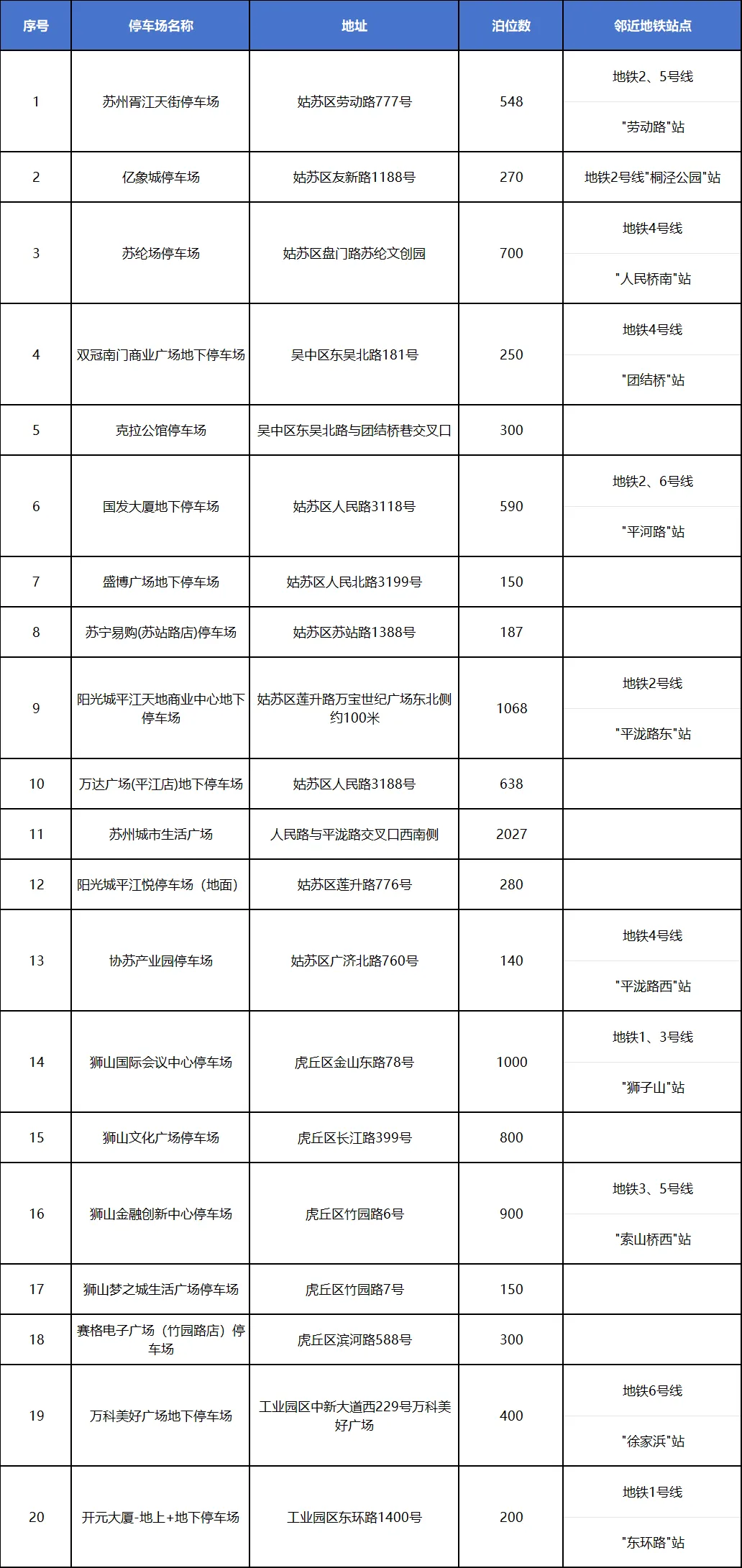 “私家车+地铁”出行停车场汇总表