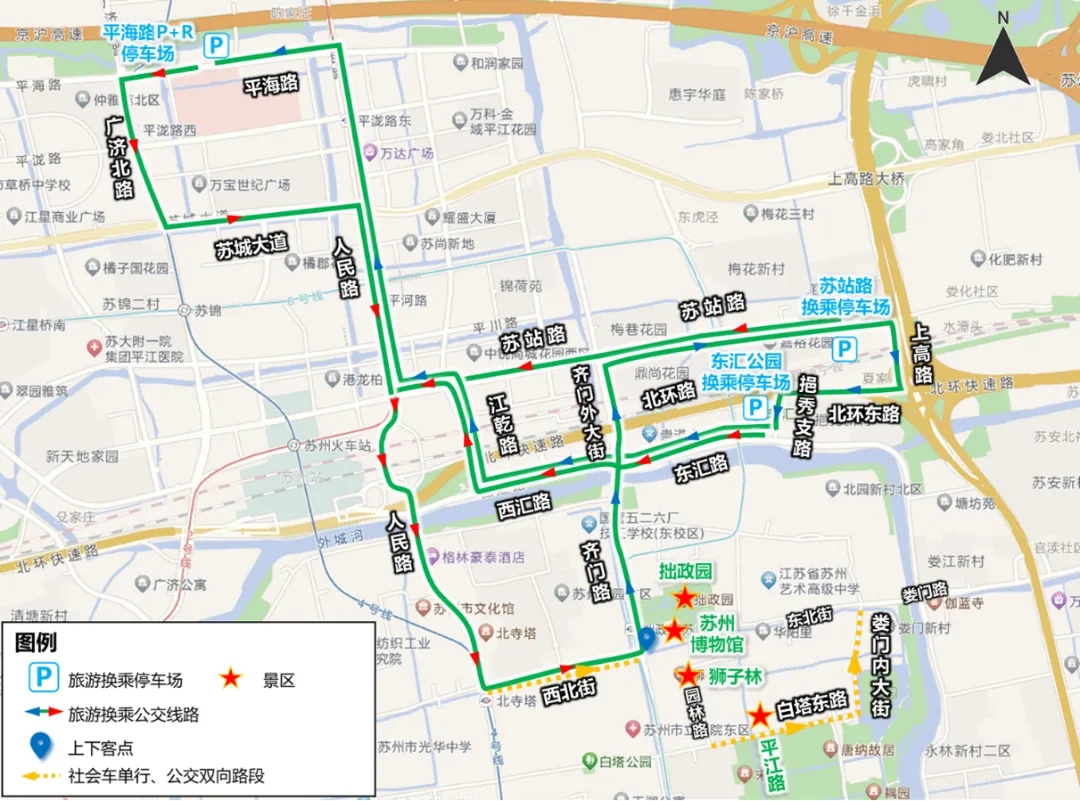苏站路换乘停车场去程线路(运行时间9:30-19:00):苏站路换乘停车场—苏站路—人民路—西北街—齐门路(拙政园景区)。