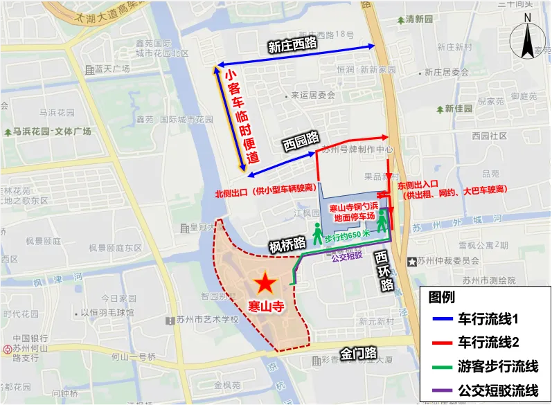 注:游客也可乘坐公交短驳专线(运行时间8:00-18:00)至寒山寺景区。