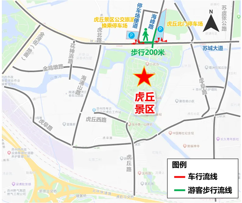虎丘北门停车场步行线路示意图