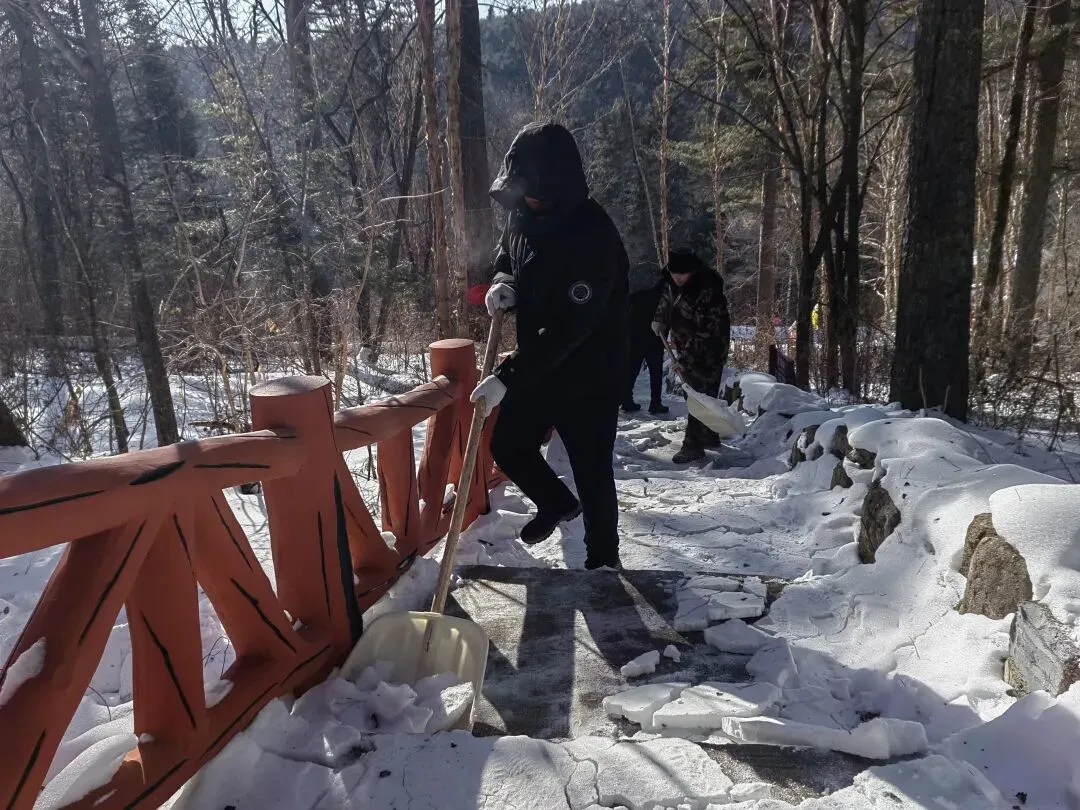 清雪现场,干部职工们不畏严寒、干劲昂扬,聚焦景区出入口、游览路线、林间栈道、观景台等关键区域,手持铁锹、雪铲等工具,攻克积雪较厚、清雪难度大等难题,通力协作、默契配合,在一日内让景区各游览区域恢复整洁畅通,切实保障了游客的通行与游览安全。